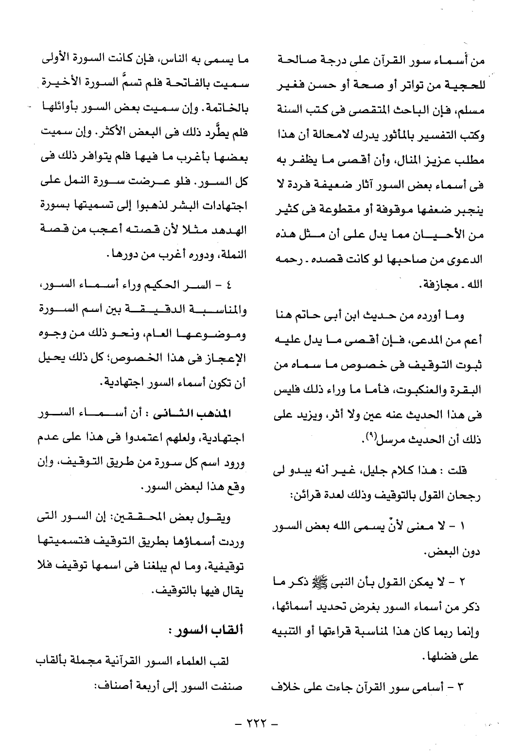 ويقول بعض المحققين: إن السور التى وردت أسماؤها بطريق التوقيف فتسميتها توقيفية، وما لم يبلغنا فى اسمها توقيف فلا يقال فيها بالتوقيف.