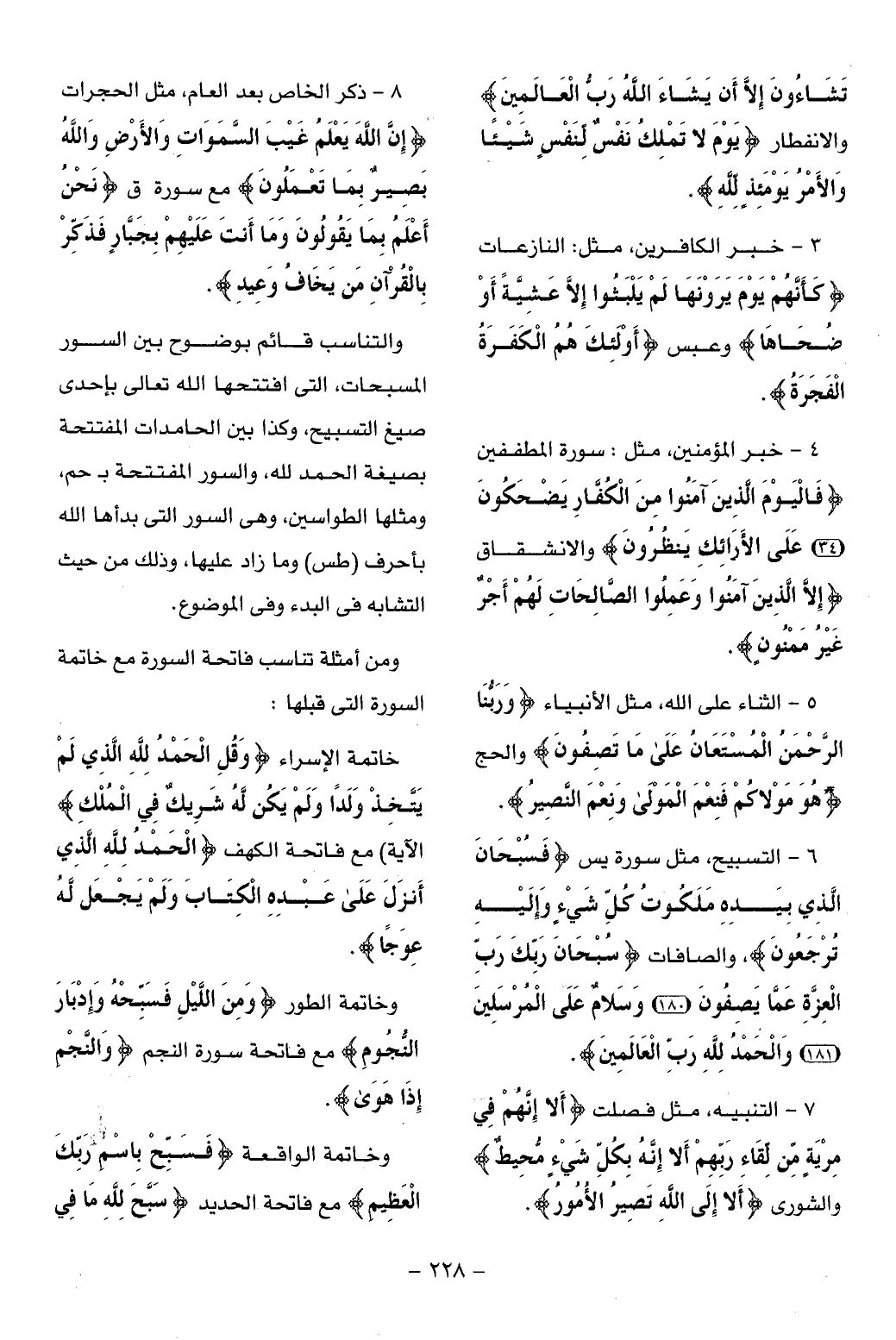 6 - التسبيح، مثل سورة يس فَسُبْحانَ الَّذِي بِيَدِهِ مَلَكُوتُ كُلِّ شَيْءٍ وَإِلَيْهِ تُرْجَعُونَ، والصافات سُبْحانَ رَبِّكَ رَبِّ الْعِزَّةِ عَمَّا يَصِفُونَ (180) وَسَلامٌ عَلَى الْمُرْسَلِينَ (181) وَالْحَمْدُ لِلَّهِ رَبِّ الْعالَمِينَ.