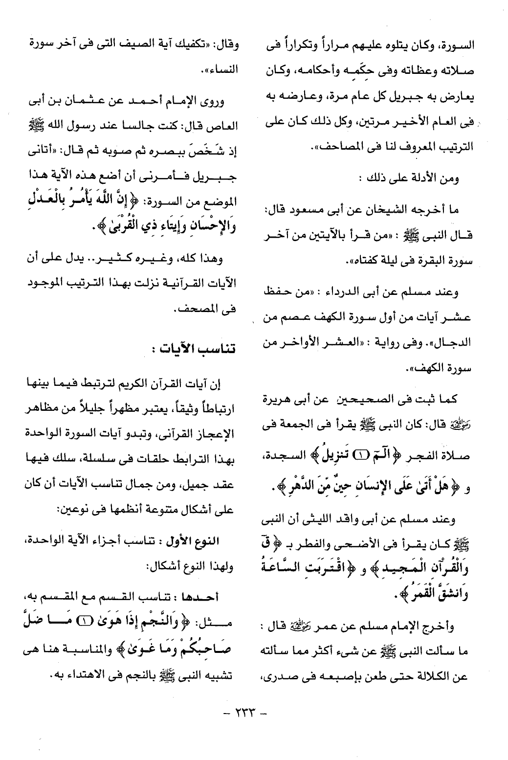 السورة، وكان يتلوه عليهم مرارا وتكرارا فى صلاته وعظاته وفى حكمه وأحكامه، وكان يعارض به جبريل كل عام مرة، وعارضه به فى العام الأخير مرتين، وكل ذلك كان على الترتيب المعروف لنا فى المصاحف».