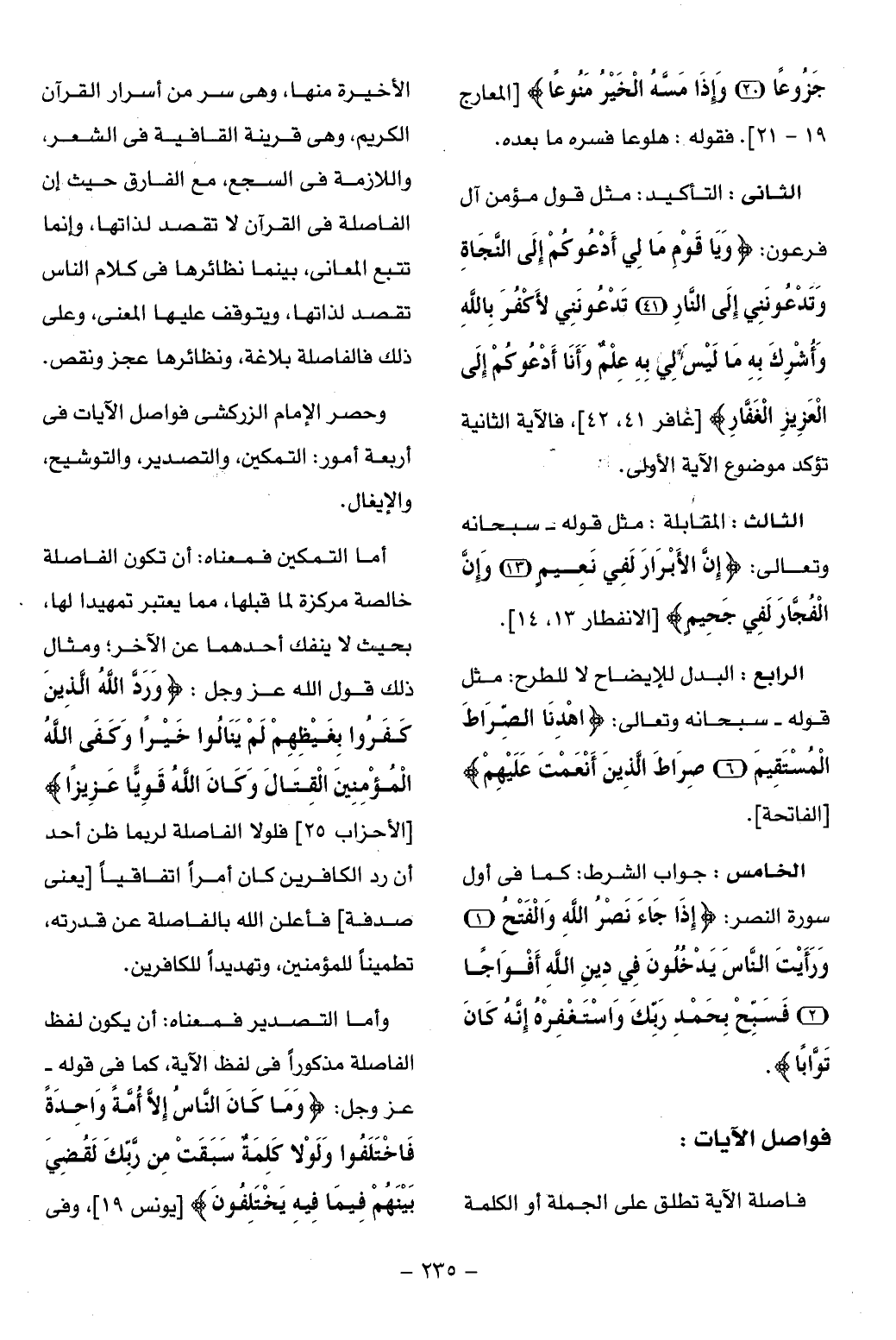 وحصر الإمام الزركشى فواصل الآيات فى أربعة أمور: التمكين، والتصدير، والتوشيح، والإيغال.