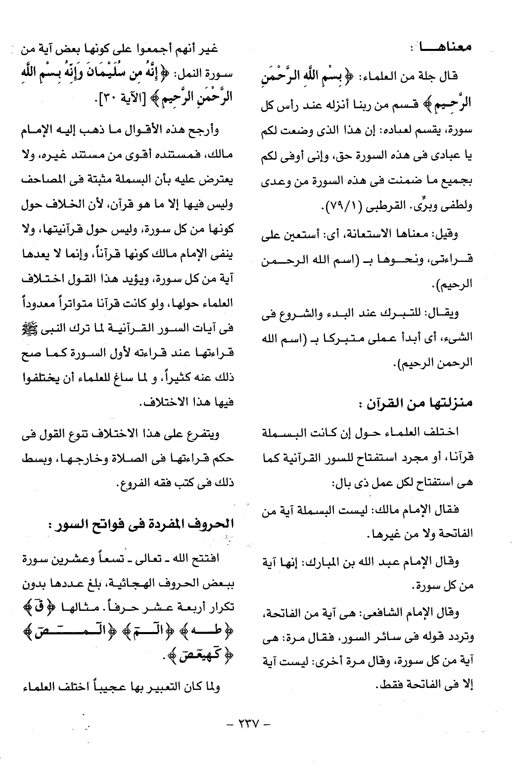 وأرجح هذه الأقوال ما ذهب إليه الإمام مالك، فمستنده أقوى من مستند غيره، ولا يعترض عليه بأن البسملة مثبتة فى المصاحف وليس فيها إلا ما هو قرآن، لأن الخلاف حول كونها من كل سورة، وليس حول قرآنيتها، ولا ينفى الإمام مالك كونها قرآنا، وإنما لا يعدها آية من كل سورة، ويؤيد هذا القول اختلاف العلماء حولها، ولو كانت قرآنا متواترا معدودا فى آيات السور القرآنية لما ترك النبى صلّى الله عليه وسلم قراءتها عند قراءته لأول السورة كما صح ذلك عنه كثيرا، ولما ساغ للعلماء أن يختلفوا فيها هذا الاختلاف.