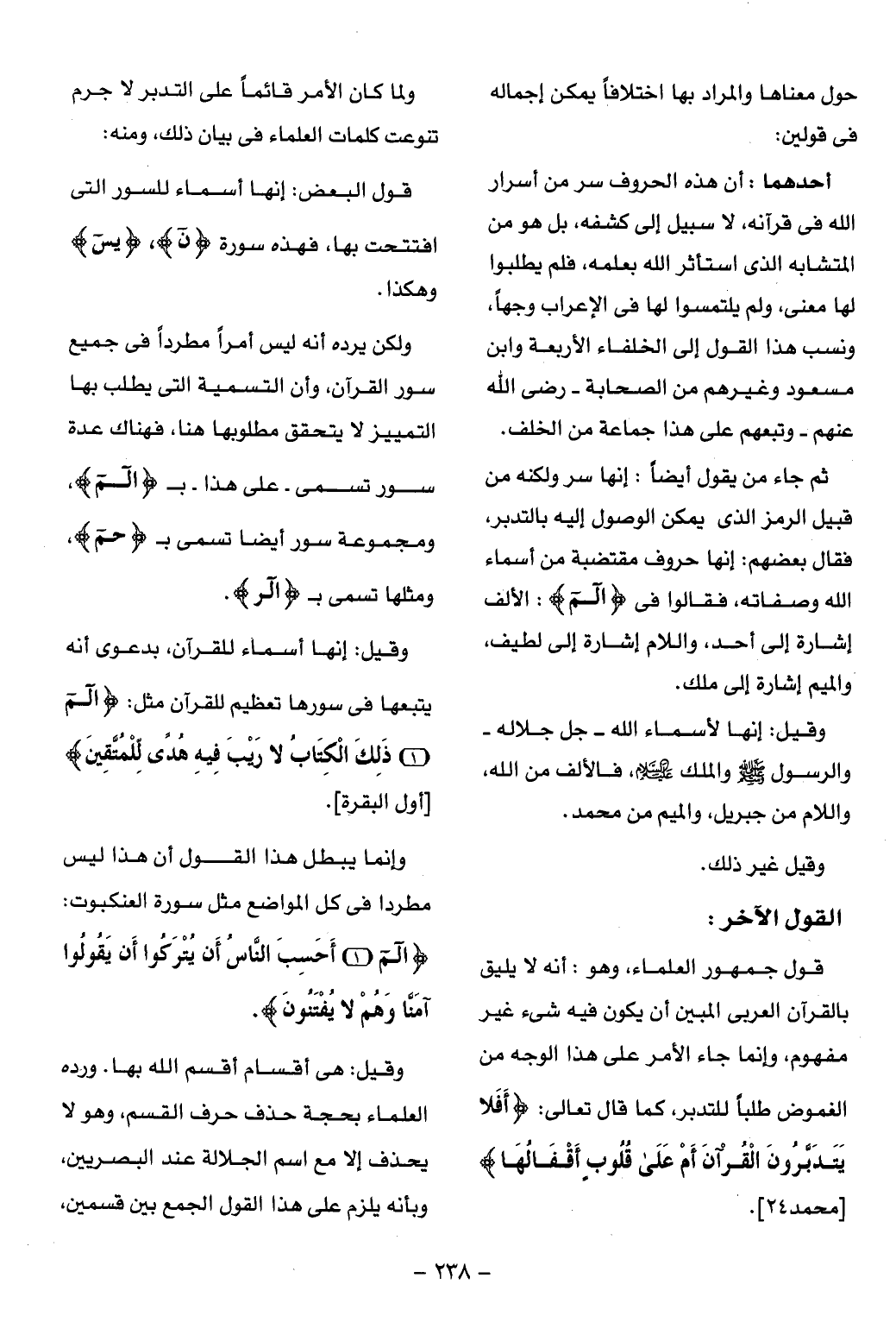 القول الآخر: قول جمهور العلماء، وهو: أنه لا يليق بالقرآن العربى المبين أن يكون فيه شىء غير مفهوم، وإنما جاء الأمر على هذا الوجه من الغموض طلبا للتدبر، كما قال تعالى: أَفَلا يَتَدَبَّرُونَ الْقُرْآنَ أَمْ عَلى قُلُوبٍ أَقْفالُها [محمد 24].