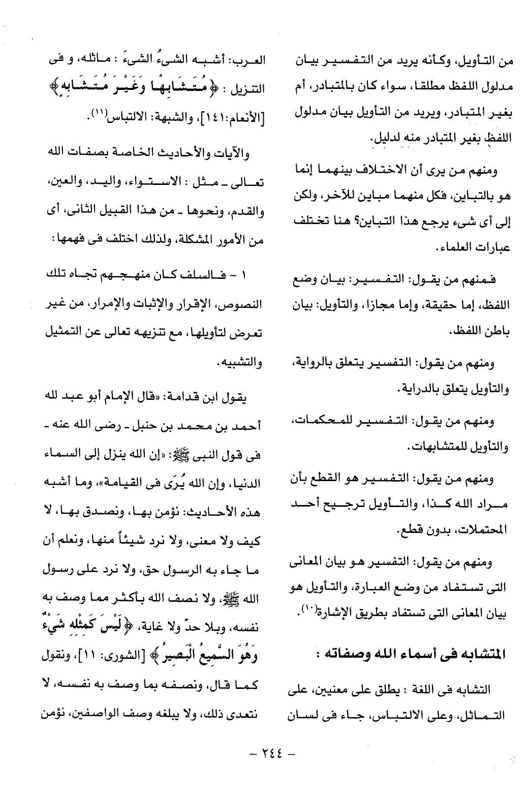 والآيات والأحاديث الخاصة بصفات الله تعالى- مثل: الاستواء، واليد، والعين، والقدم، ونحوها- من هذا القبيل الثانى، أى من الأمور المشكلة، ولذلك اختلف فى فهمها: