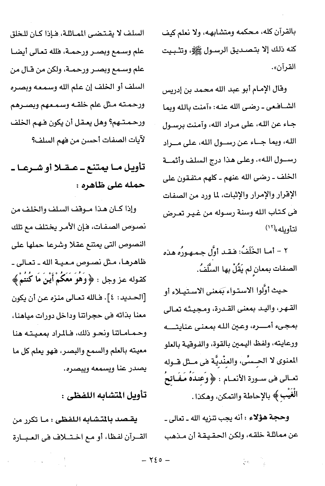 وحجة هؤلاء: أنه يجب تنزيه الله- تعالى- عن مماثلة خلقه، ولكن الحقيقة أن مذهب السلف لا يقتضى المماثلة، فإذا كان للخلق علم وسمع وبصر ورحمة، فلله تعالى أيضا علم وسمع وبصر ورحمة، ولكن من قال من السلف أو الخلف إن علم الله وسمعه وبصره ورحمته مثل علم خلقه وسمعهم وبصرهم ورحمتهم؟ وهل يعقل أن يكون فهم الخلف لآيات الصفات أحسن من فهم السلف؟