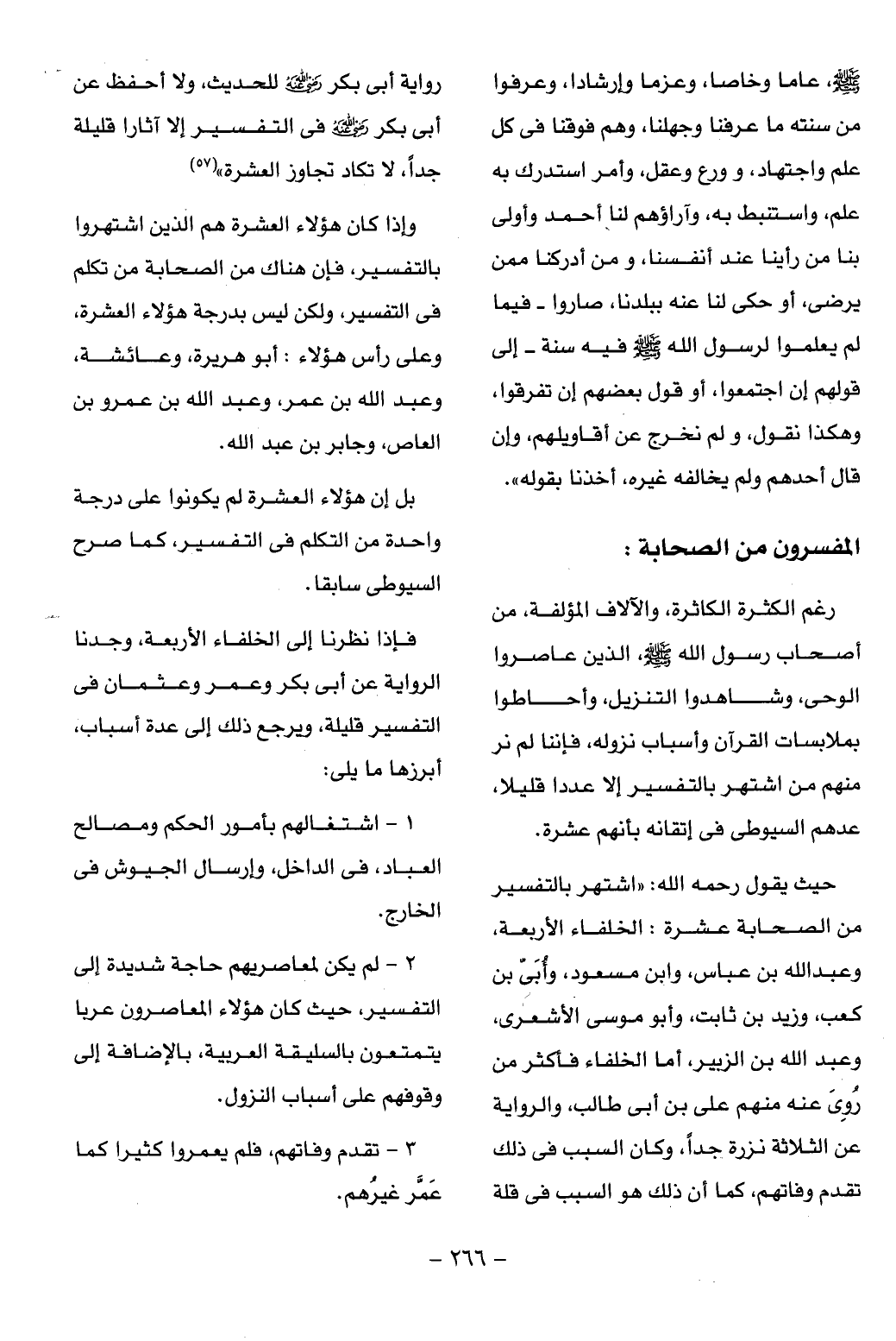 حيث يقول رحمه الله: «اشتهر بالتفسير من الصحابة عشرة: الخلفاء الأربعة، وعبد الله بن عباس، وابن مسعود، وأبىّ بن كعب، وزيد بن ثابت، وأبو موسى الأشعرى، وعبد الله بن الزبير، أما الخلفاء فأكثر من روى عنه منهم على بن أبى طالب، والرواية عن الثلاثة نزرة جدا، وكان السبب فى ذلك تقدم وفاتهم، كما أن ذلك هو السبب فى قلة رواية أبى بكر رضي الله عنه للحديث، ولا أحفظ عن أبى بكر رضي الله عنه فى التفسير إلا آثارا قليلة جدا، لا تكاد تجاوز العشرة». (¬57)