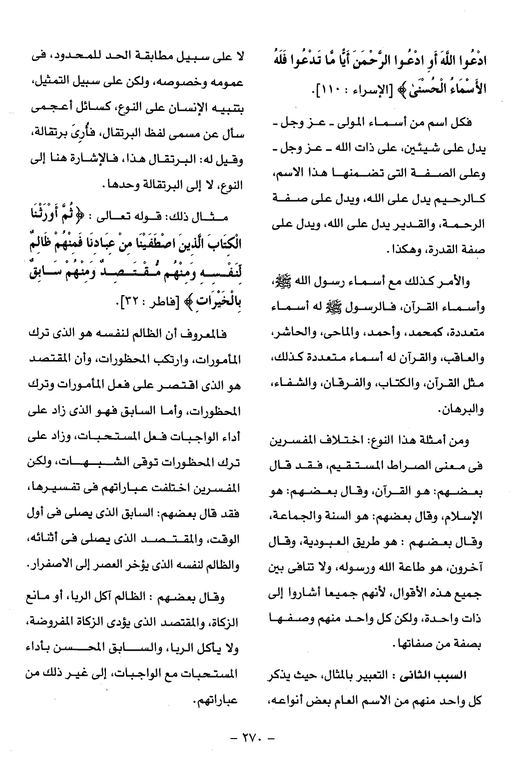 والأمر كذلك مع أسماء رسول الله صلّى الله عليه وسلم، وأسماء القرآن، فالرسول صلّى الله عليه وسلم له أسماء متعددة، كمحمد، وأحمد، والماحى، والحاشر، والعاقب، والقرآن له أسماء متعددة كذلك، مثل القرآن، والكتاب، والفرقان، والشفاء، والبرهان.