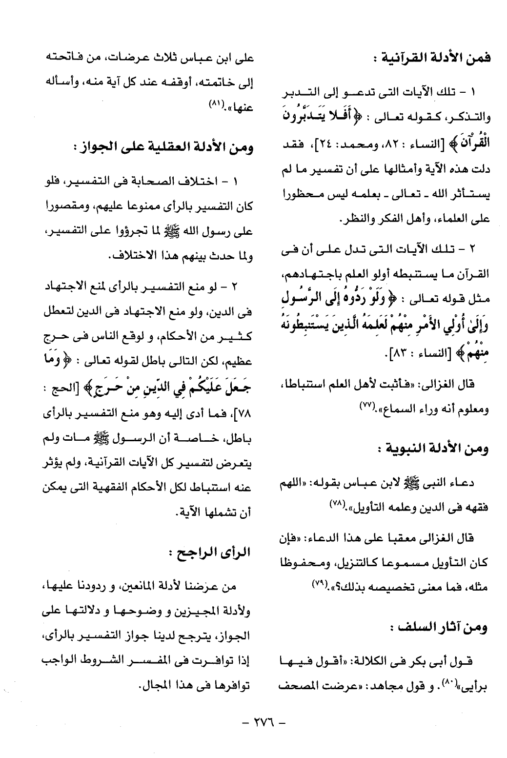 78]، فما أدى إليه وهو منع التفسير بالرأى باطل، خاصة أن الرسول صلّى الله عليه وسلم مات ولم يتعرض لتفسير كل الآيات القرآنية، ولم يؤثر عنه استنباط لكل الأحكام الفقهية التى يمكن أن تشملها الآية.