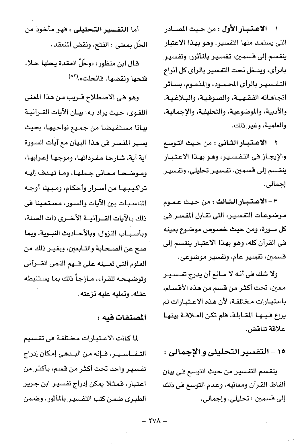 2 - الاعتبار الثانى: من حيث التوسع والإيجاز فى التفسير، وهو بهذا الاعتبار ينقسم إلى قسمين، تفسير تحليلى، وتفسير إجمالى.