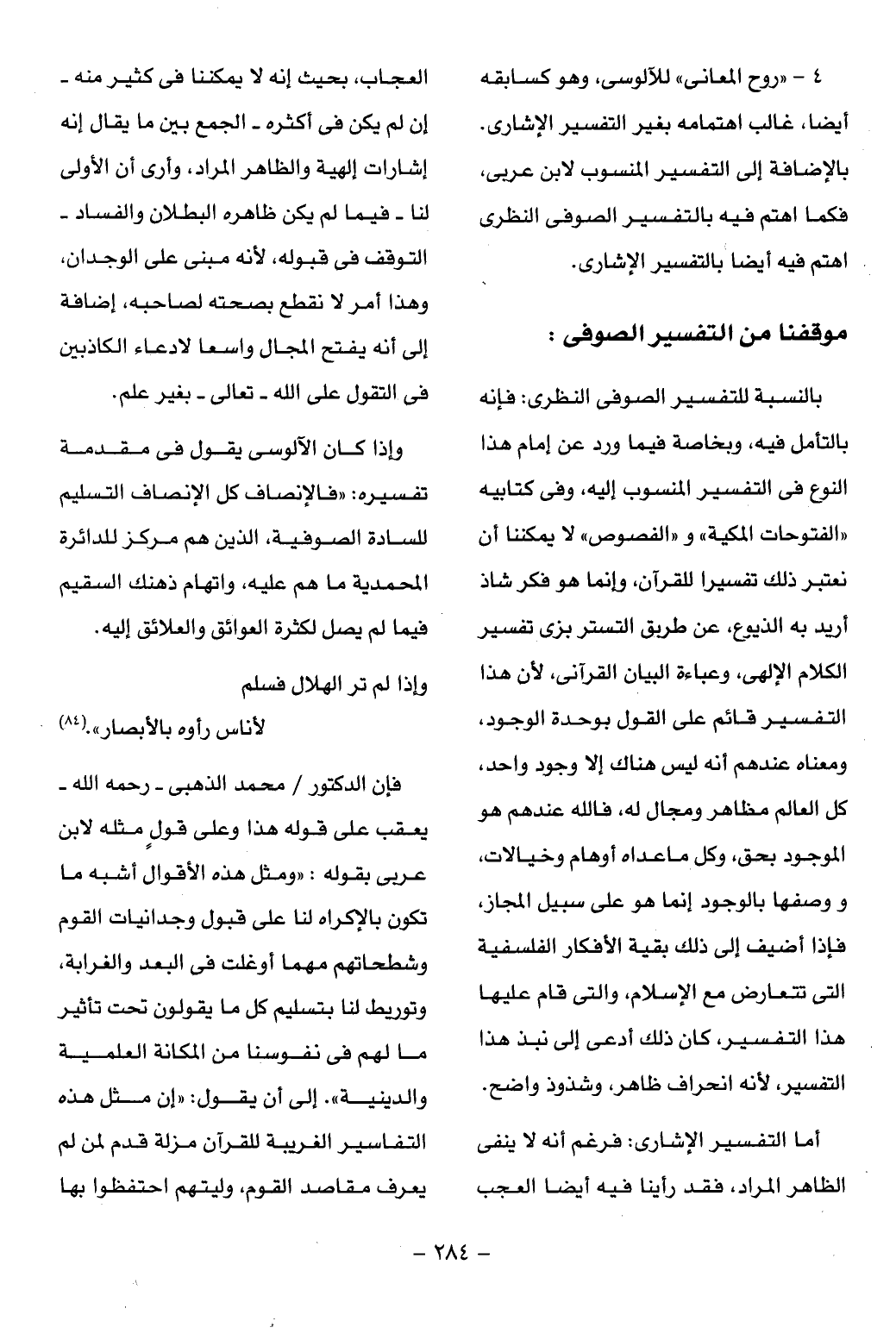 موقفنا من التفسير الصوفى: بالنسبة للتفسير الصوفى النظرى: فإنه بالتأمل فيه، وبخاصة فيما ورد عن إمام هذا النوع فى التفسير المنسوب إليه، وفى كتابيه «الفتوحات المكية» و «الفصوص» لا يمكننا أن نعتبر ذلك تفسيرا للقرآن، وإنما هو فكر شاذ أريد به الذيوع، عن طريق التستر بزى تفسير الكلام الإلهى، وعباءة البيان القرآنى، لأن هذا التفسير قائم على القول بوحدة الوجود، ومعناه عندهم أنه ليس هناك إلا وجود واحد، كل العالم مظاهر ومجال له، فالله عندهم هو الموجود بحق، وكل ما عداه أوهام وخيالات، ووصفها بالوجود إنما هو على سبيل المجاز، فإذا أضيف إلى ذلك بقية الأفكار الفلسفية التى تتعارض مع الإسلام، والتى قام عليها هذا التفسير، كان ذلك أدعى إلى نبذ هذا التفسير، لأنه انحراف ظاهر، وشذوذ واضح.