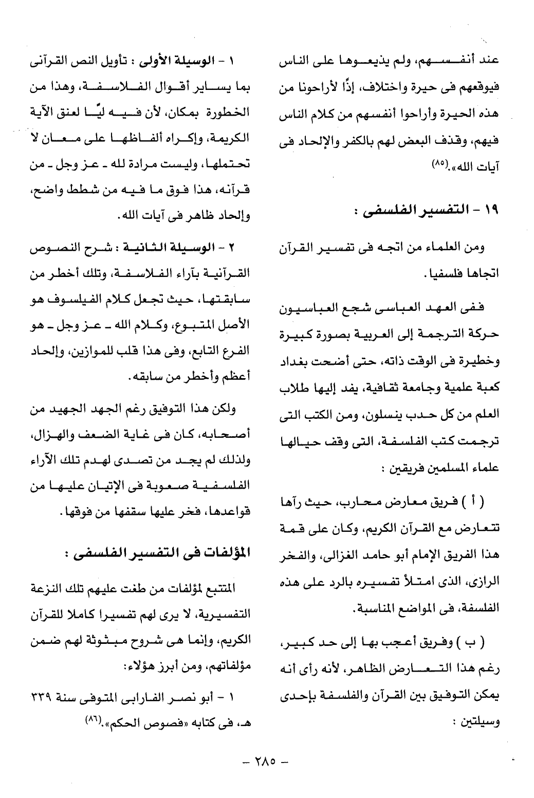 1 - الوسيلة الأولى: تأويل النص القرآنى بما يساير أقوال الفلاسفة، وهذا من الخطورة بمكان، لأن فيه ليّا لعنق الآية الكريمة، وإكراه ألفاظها على معان لا تحتملها، وليست مرادة لله- عز وجل- من قرآنه، هذا فوق ما فيه من شطط واضح، وإلحاد ظاهر فى آيات الله.