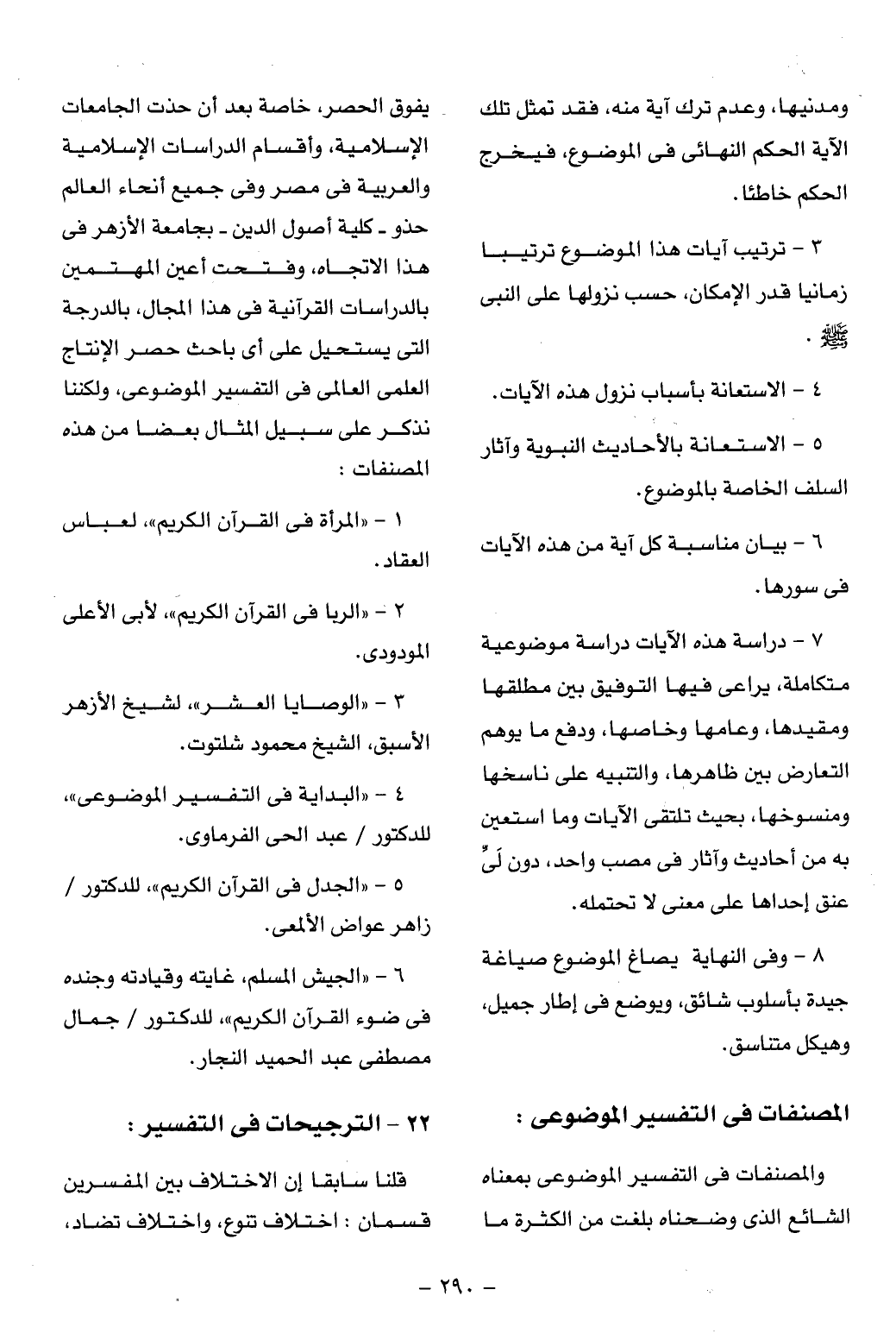 7 - دراسة هذه الآيات دراسة موضوعية متكاملة، يراعى فيها التوفيق بين مطلقها ومقيدها، وعامها وخاصها، ودفع ما يوهم التعارض بين ظاهرها، والتنبيه على ناسخها ومنسوخها، بحيث تلتقى الآيات وما استعين به من أحاديث وآثار فى مصب واحد، دون لىّ عنق إحداها على معنى لا تحتمله.