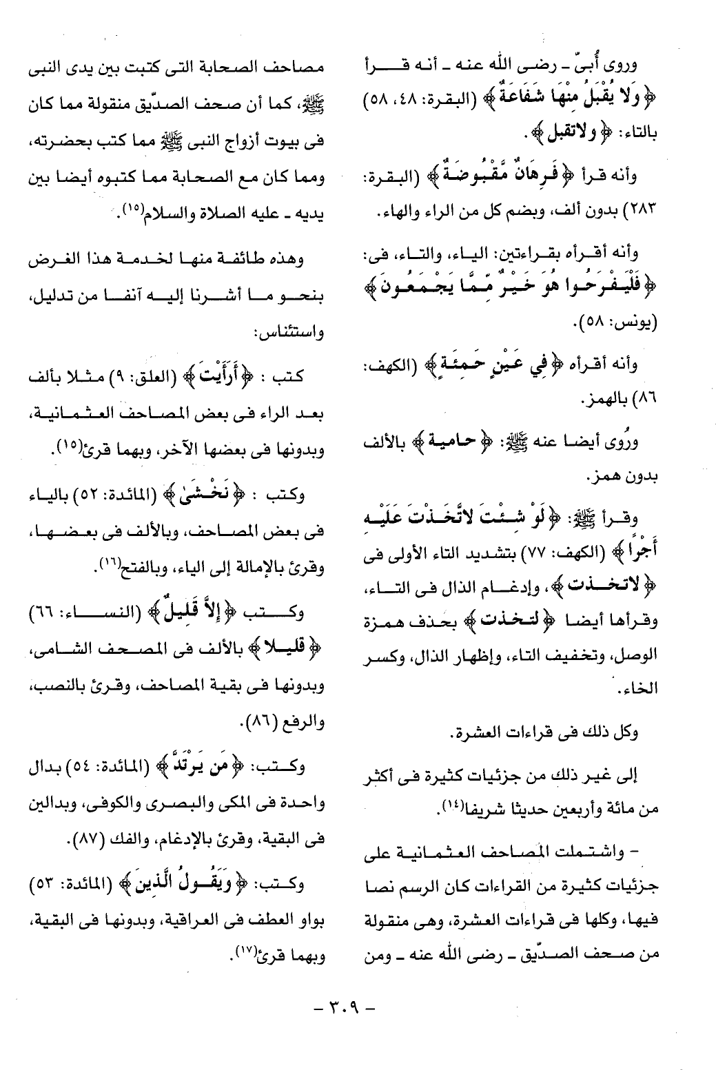 - واشتملت المصاحف العثمانية على جزئيات كثيرة من القراءات كان الرسم نصا فيها، وكلها فى قراءات العشرة، وهى منقولة من صحف الصدّيق- رضى الله عنه- ومن مصاحف الصحابة التى كتبت بين يدى النبى صلّى الله عليه وسلم، كما أن صحف الصدّيق منقولة مما كان فى بيوت أزواج النبى صلّى الله عليه وسلم مما كتب بحضرته، ومما كان مع الصحابة مما كتبوه أيضا بين يديه- عليه الصلاة والسلام (¬15).