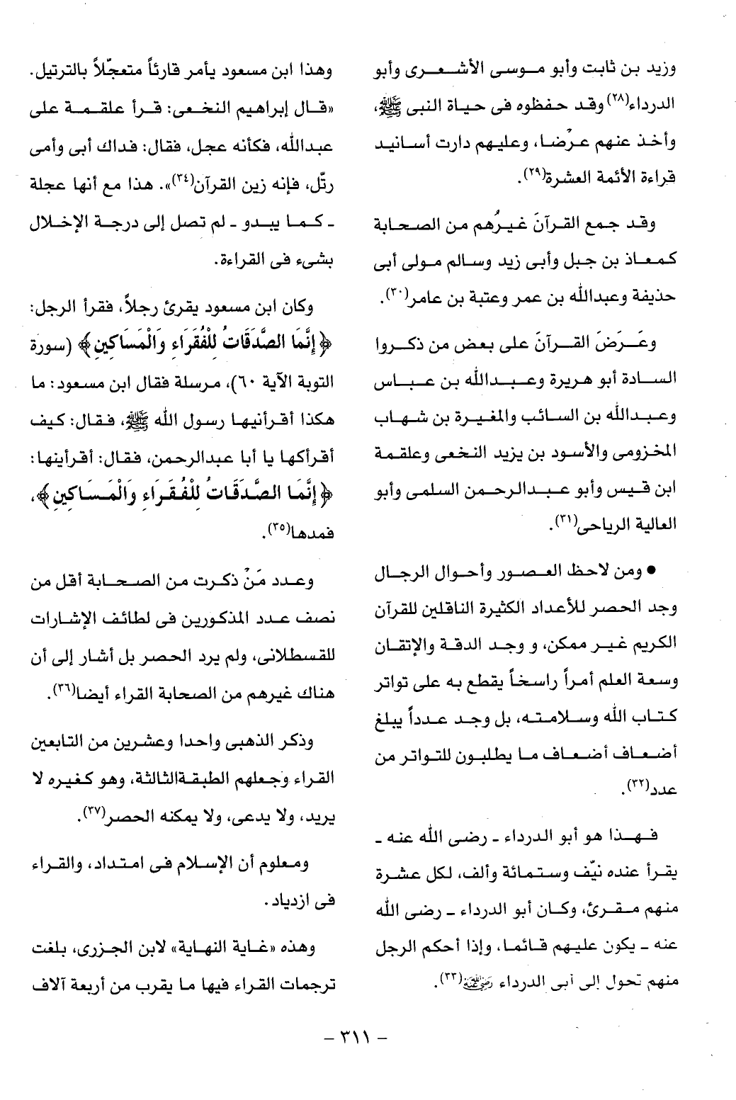 وعدد من ذكرت من الصحابة أقل من نصف عدد المذكورين فى لطائف الإشارات للقسطلانى، ولم يرد الحصر بل أشار إلى أن هناك غيرهم من الصحابة القراء أيضا (¬36).