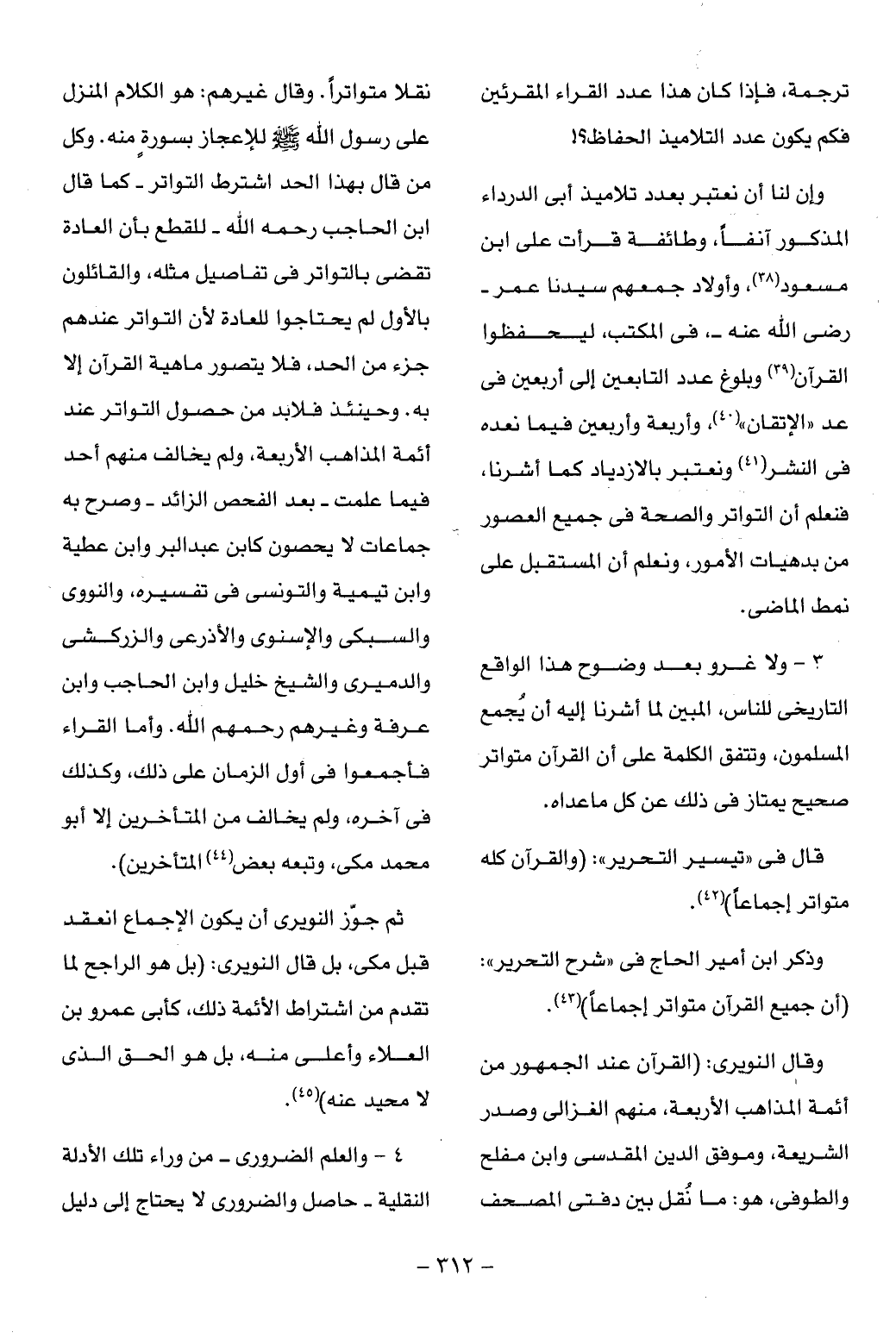 وقال النويرى: (القرآن عند الجمهور من أئمة المذاهب الأربعة، منهم الغزالى وصدر الشريعة، وموفق الدين المقدسى وابن مفلح والطوفى، هو: ما نقل بين دفتى المصحف نقلا متواترا. وقال غيرهم: هو الكلام المنزل على رسول الله صلّى الله عليه وسلم للإعجاز بسورة منه. وكل من قال بهذا الحد اشترط التواتر- كما قال ابن الحاجب رحمه الله- للقطع بأن العادة تقضى بالتواتر فى تفاصيل مثله، والقائلون بالأول لم يحتاجوا للعادة لأن التواتر عندهم جزء من الحد، فلا يتصور ماهية القرآن إلا به. وحينئذ فلا بد من حصول التواتر عند أئمة المذاهب الأربعة، ولم يخالف منهم أحد فيما علمت- بعد الفحص الزائد- وصرح به جماعات لا يحصون كابن عبد البر وابن عطية وابن تيمية والتونسى فى تفسيره، والنووى والسبكى والإسنوى والأذرعى والزركشى والدميرى والشيخ خليل وابن الحاجب وابن عرفة وغيرهم رحمهم الله. وأما القراء فأجمعوا فى أول الزمان على ذلك، وكذلك فى آخره، ولم يخالف من المتأخرين إلا أبو محمد مكى، وتبعه بعض (¬44) المتأخرين).