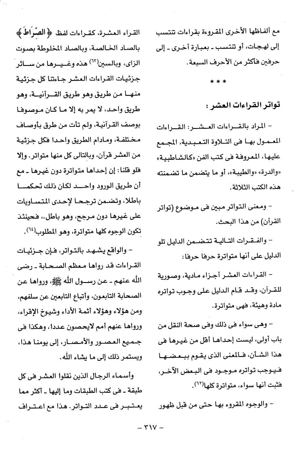 - المراد بالقراءات العشر: القراءات المعمول بها فى التلاوة التعبدية، المجمع عليها، المعروفة فى كتب الفن «كالشاطبية» «والدرة» «والطيبة»، أو ما يتضمن ما تضمنته هذه الكتب الثلاثة.