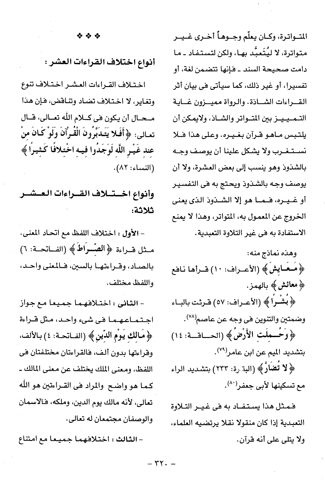 اختلاف القراءات العشر اختلاف تنوع وتغاير، لا اختلاف تضاد وتناقض، فإن هذا محال أن يكون فى كلام الله تعالى، قال تعالى: أَفَلا يَتَدَبَّرُونَ الْقُرْآنَ وَلَوْ كانَ مِنْ عِنْدِ غَيْرِ اللَّهِ لَوَجَدُوا فِيهِ اخْتِلافاً كَثِيراً (النساء: 82).