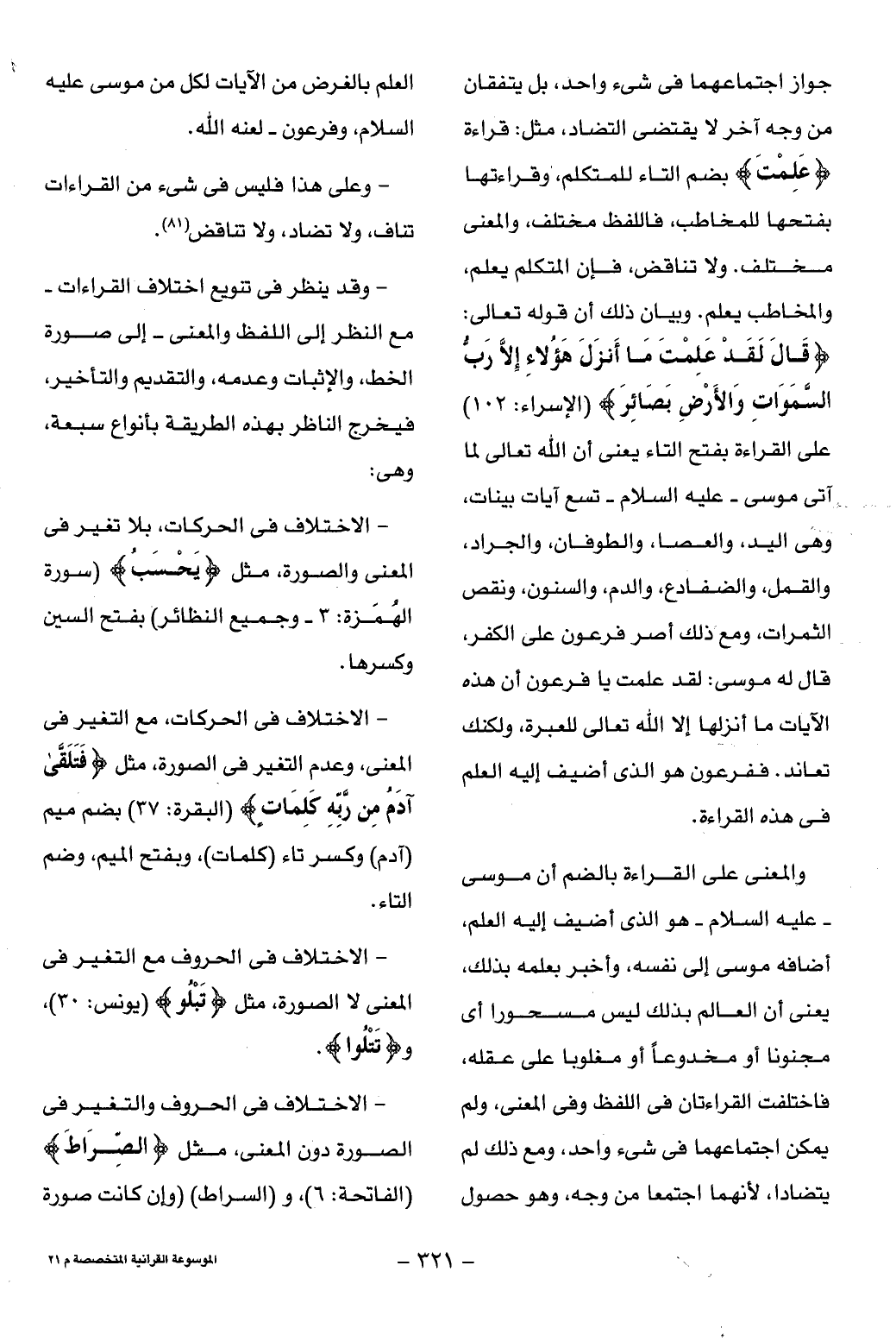 والمعنى على القراءة بالضم أن موسى- عليه السلام- هو الذى أضيف إليه العلم، أضافه موسى إلى نفسه، وأخبر بعلمه بذلك، يعنى أن العالم بذلك ليس مسحورا أى مجنونا أو مخدوعا أو مغلوبا على عقله، فاختلفت القراءتان فى اللفظ وفى المعنى، ولم يمكن اجتماعهما فى شىء واحد، ومع ذلك لم يتضادا، لأنهما اجتمعا من وجه، وهو حصول العلم بالغرض من الآيات لكل من موسى عليه السلام، وفرعون- لعنه الله.