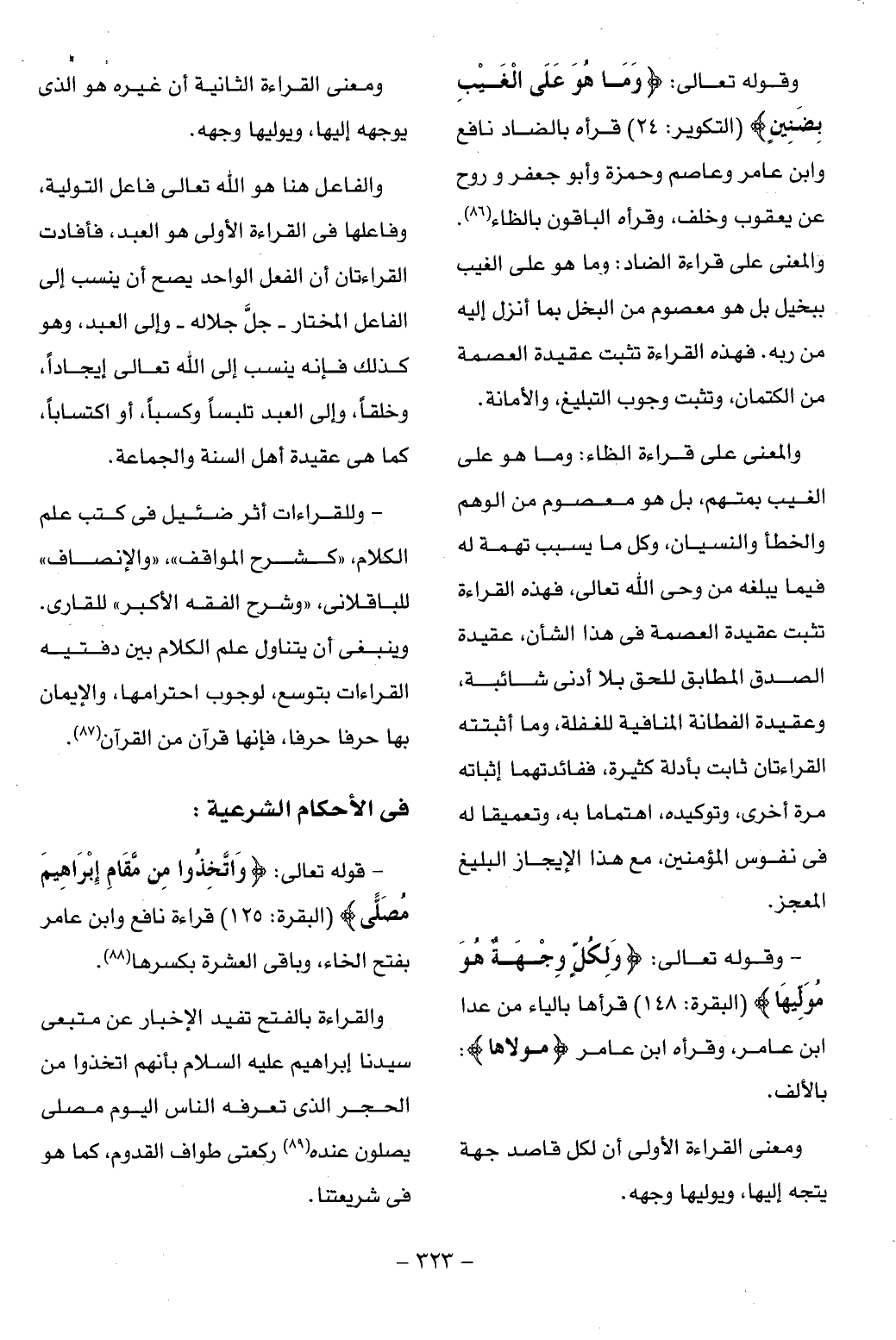 وينبغى أن يتناول علم الكلام بين دفتيه القراءات بتوسع، لوجوب احترامها، والإيمان بها حرفا حرفا، فإنها قرآن من القرآن (¬87).