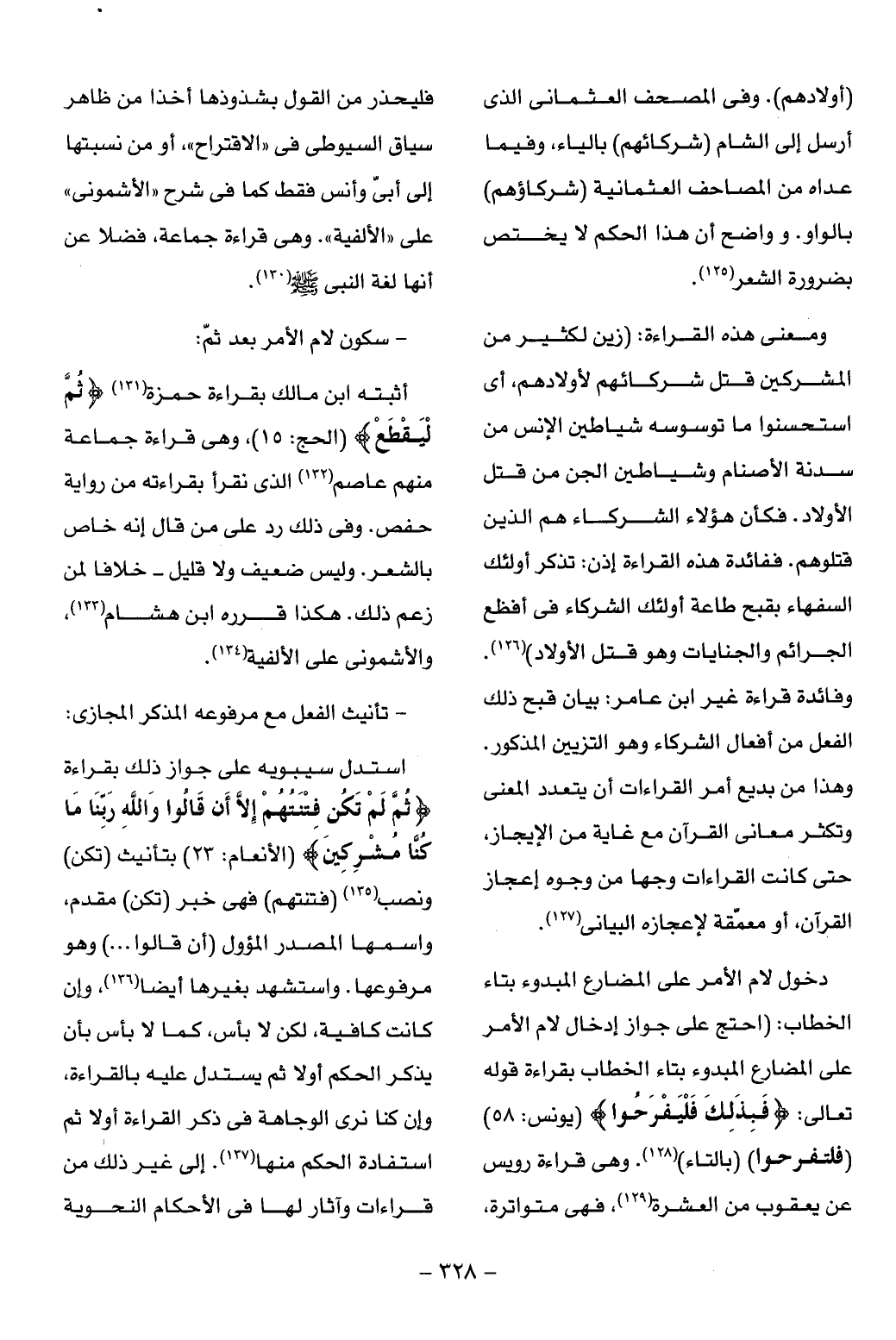 (أولادهم). وفى المصحف العثمانى الذى أرسل إلى الشام (شركائهم) بالياء، وفيما عداه من المصاحف العثمانية (شركاؤهم) بالواو. وواضح أن هذا الحكم لا يختص بضرورة الشعر (¬125).
