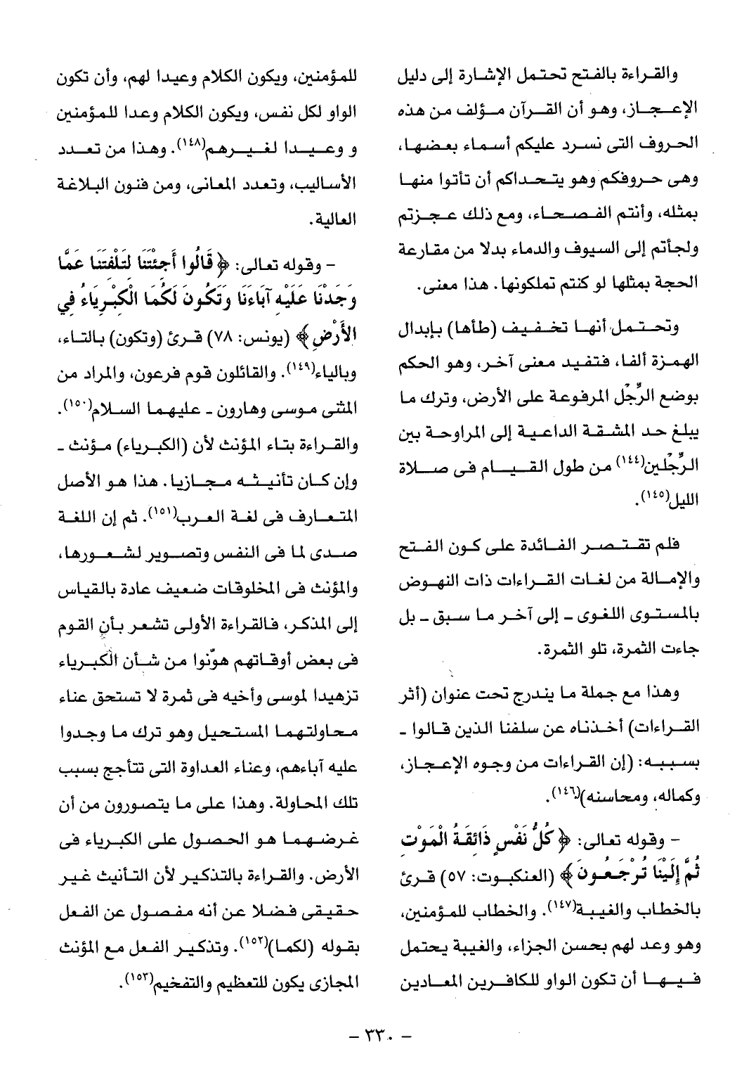 - وقوله تعالى: كُلُّ نَفْسٍ ذائِقَةُ الْمَوْتِ ثُمَّ إِلَيْنا تُرْجَعُونَ (العنكبوت: 57) قرئ بالخطاب والغيبة (¬147). والخطاب للمؤمنين، وهو وعد لهم بحسن الجزاء، والغيبة يحتمل فيها أن تكون الواو للكافرين المعادين للمؤمنين، ويكون الكلام وعيدا لهم، وأن تكون الواو لكل نفس، ويكون الكلام وعدا للمؤمنين ووعيدا لغيرهم (¬148). وهذا من تعدد الأساليب، وتعدد المعانى، ومن فنون البلاغة العالية.