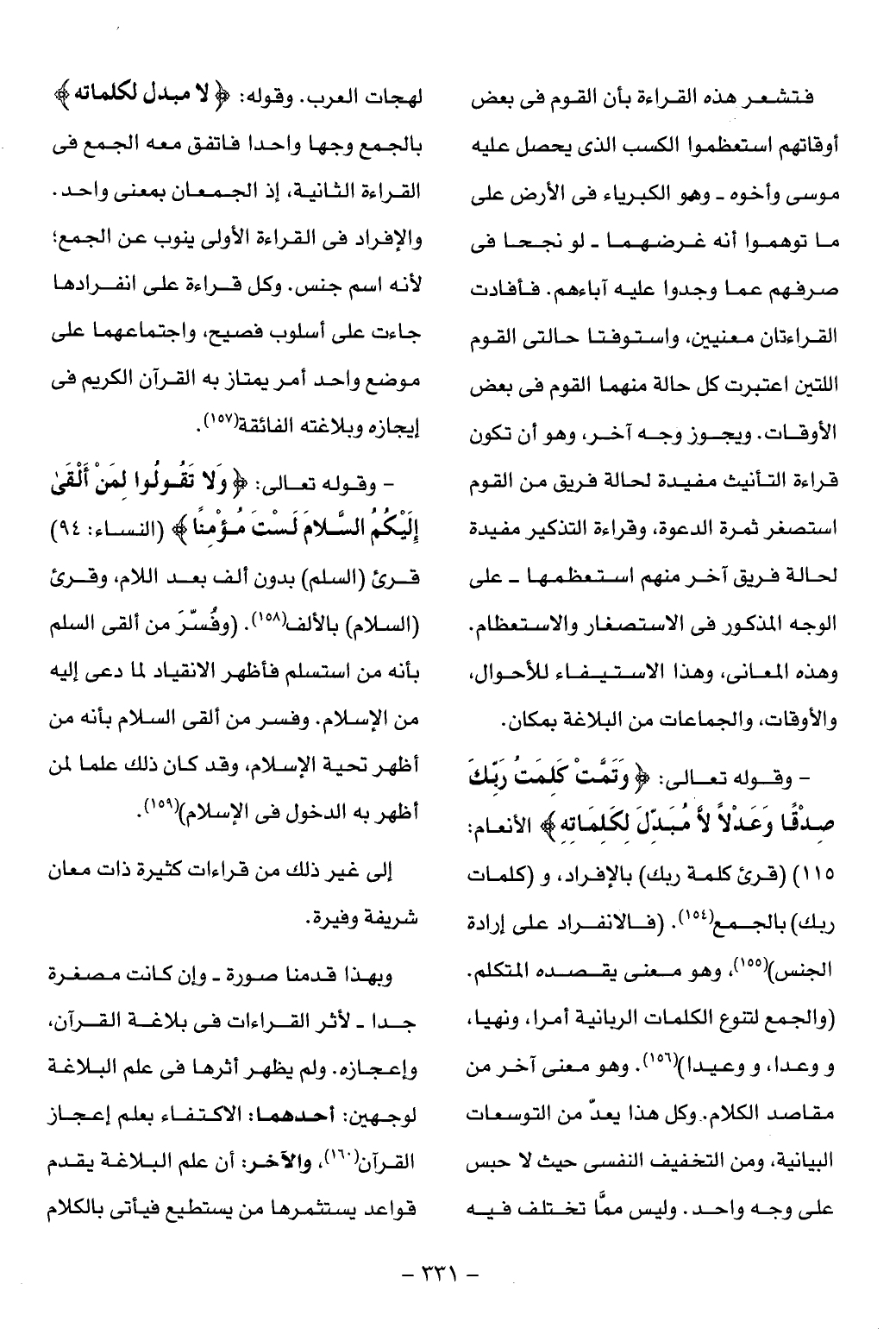 (والجمع لتنوع الكلمات الربانية أمرا، ونهيا، ووعدا، ووعيدا) (¬156). وهو معنى آخر من مقاصد الكلام. وكل هذا يعدّ من التوسعات البيانية، ومن التخفيف النفسى حيث لا حبس على وجه واحد. وليس ممّا تختلف فيه لهجات العرب. وقوله: لا مُبَدِّلَ لِكَلِماتِهِ بالجمع وجها واحدا فاتفق معه الجمع فى القراءة الثانية، إذ الجمعان بمعنى واحد.