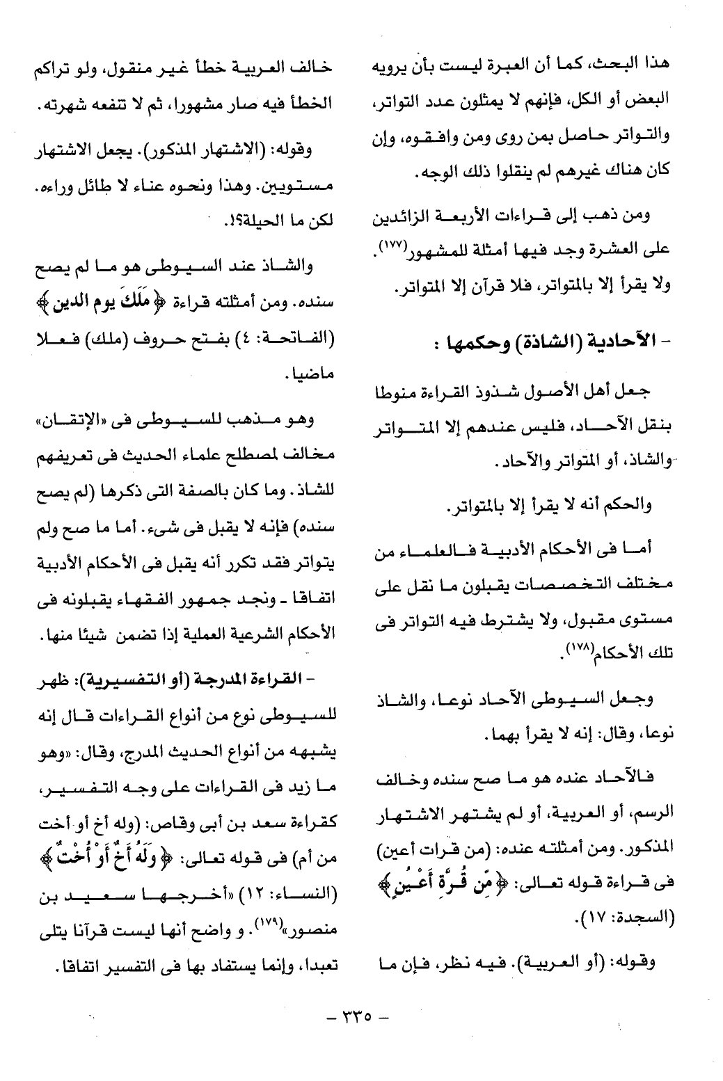 وهو مذهب للسيوطى فى «الإتقان» مخالف لمصطلح علماء الحديث فى تعريفهم للشاذ. وما كان بالصفة التى ذكرها (لم يصح سنده) فإنه لا يقبل فى شىء. أما ما صح ولم يتواتر فقد تكرر أنه يقبل فى الأحكام الأدبية اتفاقا- ونجد جمهور الفقهاء يقبلونه فى الأحكام الشرعية العملية إذا تضمن شيئا منها.