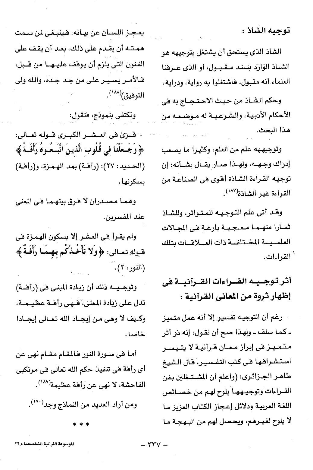 وتوجيهه علم من العلم، وكثيرا ما يصعب إدراك وجهه، ولهذا صار يقال بشأنه: إن توجيه القراءة الشاذة أقوى فى الصناعة من القراءة غير الشاذة (¬187).