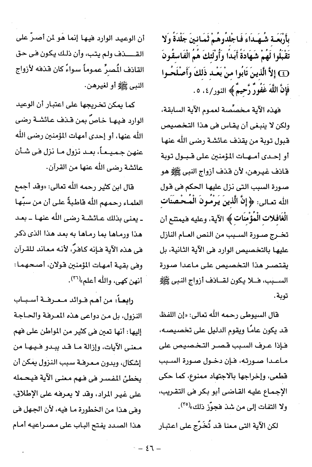 فهذه الآية مخصّصة لعموم الآية السابقة، ولكن لا ينبغى أن يقاس فى هذا التخصيص قبول توبة من يقذف عائشة رضى الله عنها أو إحدى أمهات المؤمنين على قبول توبة قاذف غيرهن، لأن قذف أزواج النبى صلّى الله عليه وسلم هو صورة السبب التى نزل عليها الحكم فى قول الله تعالى: إِنَّ الَّذِينَ يَرْمُونَ الْمُحْصَناتِ الْغافِلاتِ الْمُؤْمِناتِ الآية، وعليه فيمتنع أن تخرج صورة السبب من النص العام النازل عليها بالتخصيص الوارد فى الآية الثانية، بل يقتصر هذا التخصيص على ما عدا صورة السبب، فلا يكون لقاذف أزواج النبى صلّى الله عليه وسلم توبة.