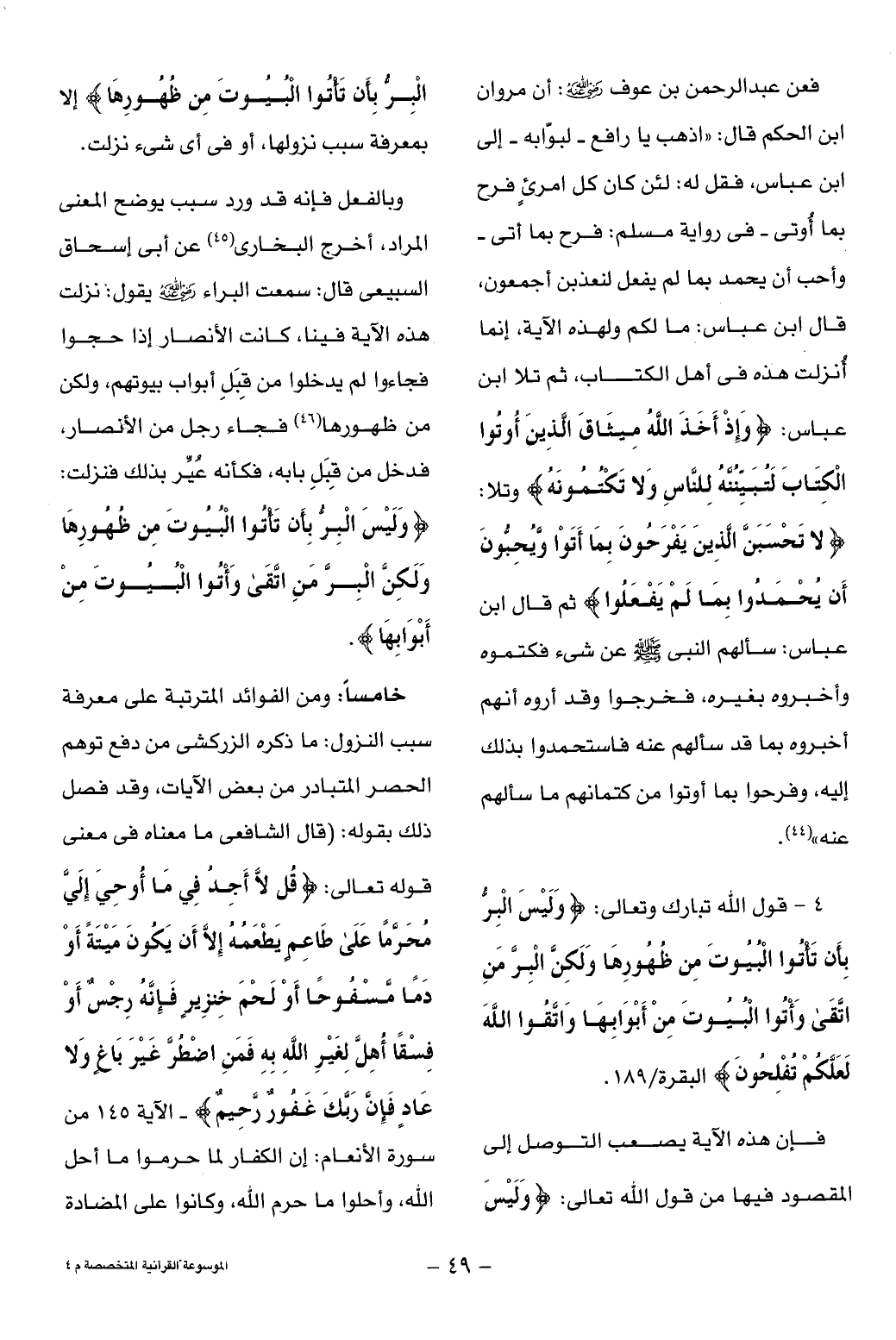 4 - قول الله تبارك وتعالى: وَلَيْسَ الْبِرُّ بِأَنْ تَأْتُوا الْبُيُوتَ مِنْ ظُهُورِها وَلكِنَّ الْبِرَّ مَنِ اتَّقى وَأْتُوا الْبُيُوتَ مِنْ أَبْوابِها وَاتَّقُوا اللَّهَ لَعَلَّكُمْ تُفْلِحُونَ البقرة/ 189.