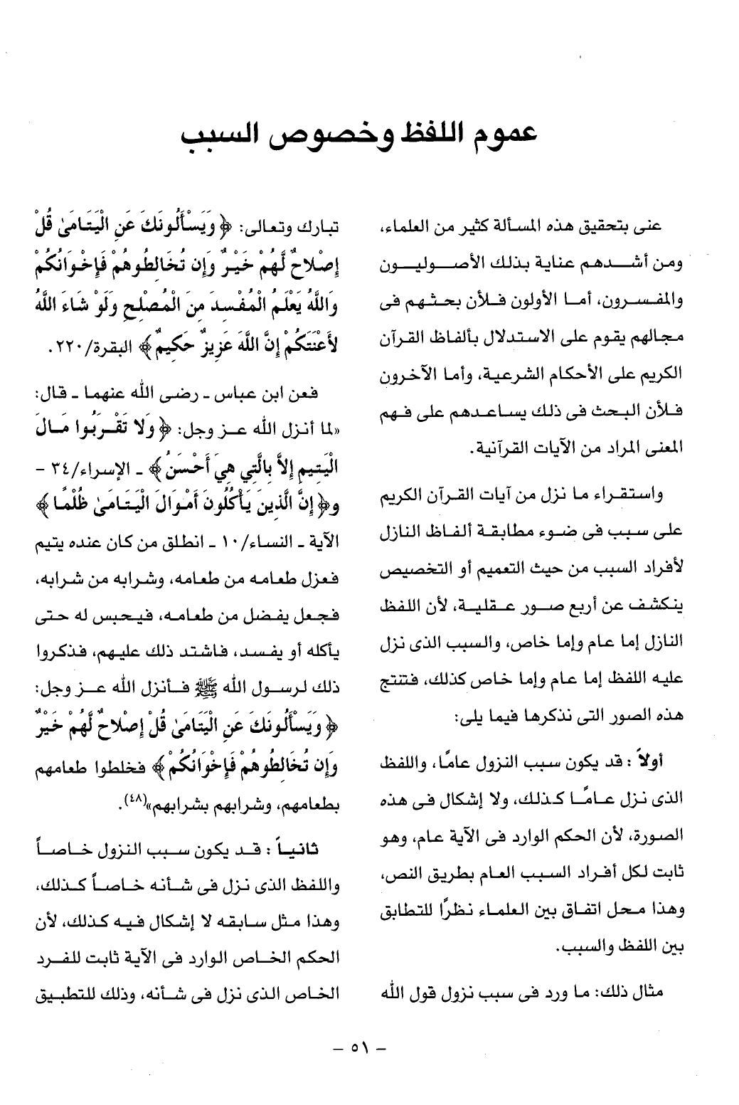 ثانيا: قد يكون سبب النزول خاصا واللفظ الذى نزل فى شأنه خاصا كذلك، وهذا مثل سابقه لا إشكال فيه كذلك، لأن الحكم الخاص الوارد فى الآية ثابت للفرد الخاص الذى نزل فى شأنه، وذلك للتطبيق