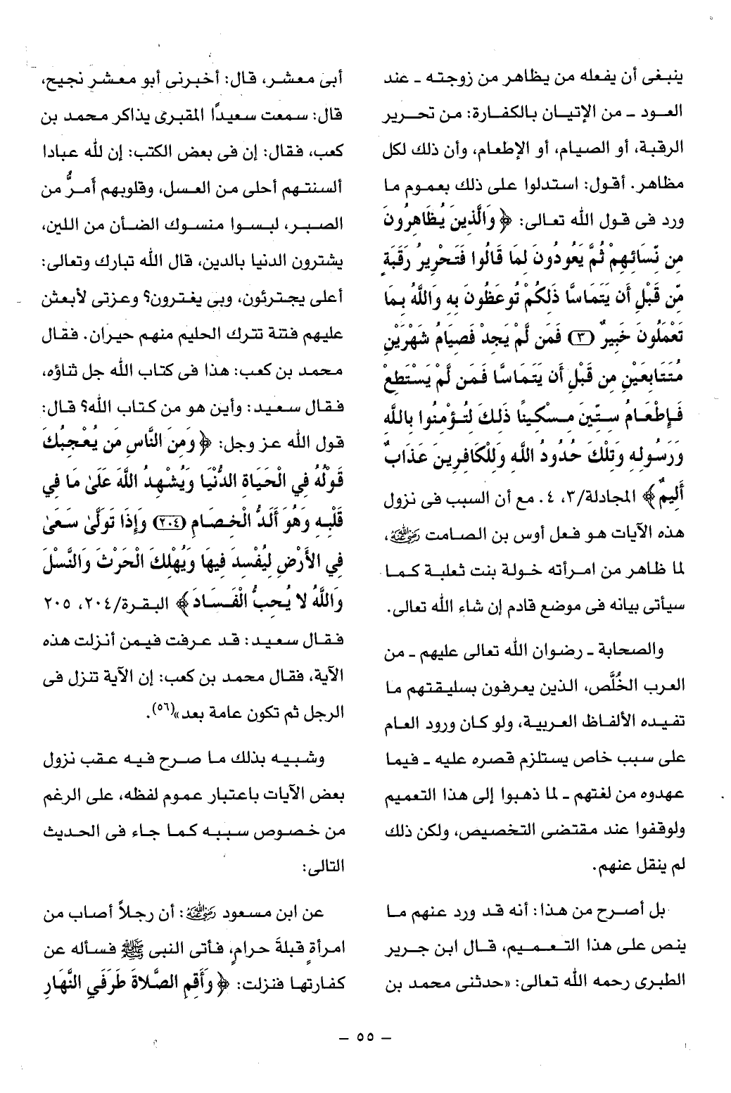 قول الله عز وجل: وَمِنَ النَّاسِ مَنْ يُعْجِبُكَ قَوْلُهُ فِي الْحَياةِ الدُّنْيا وَيُشْهِدُ اللَّهَ عَلى ما فِي قَلْبِهِ وَهُوَ أَلَدُّ الْخِصامِ (204) وَإِذا تَوَلَّى سَعى فِي الْأَرْضِ لِيُفْسِدَ فِيها وَيُهْلِكَ الْحَرْثَ وَالنَّسْلَ وَاللَّهُ لا يُحِبُّ الْفَسادَ البقرة/ 204، 205 فقال سعيد: قد عرفت فيمن أنزلت هذه الآية، فقال محمد بن كعب: إن الآية تنزل فى الرجل ثم تكون عامة بعد» (¬56).
