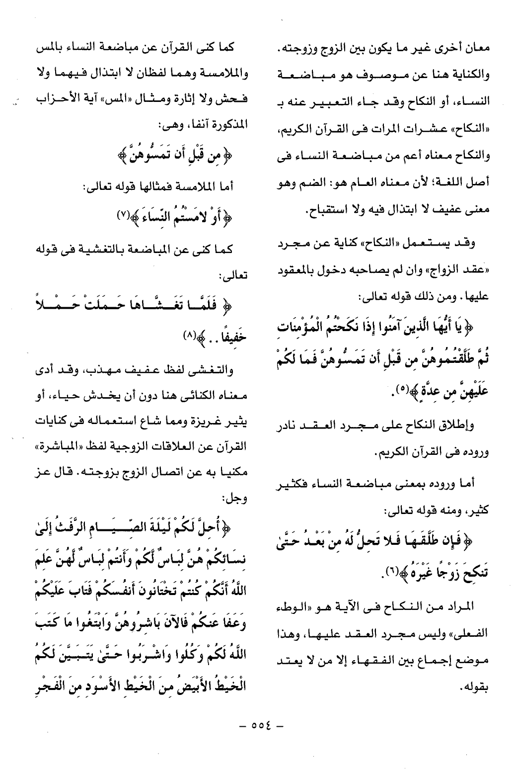 كما كنى القرآن عن مباضعة النساء بالمس والملامسة وهما لفظان لا ابتذال فيهما ولا فحش ولا إثارة ومثال «المس» آية الأحزاب المذكورة آنفا، وهى:
