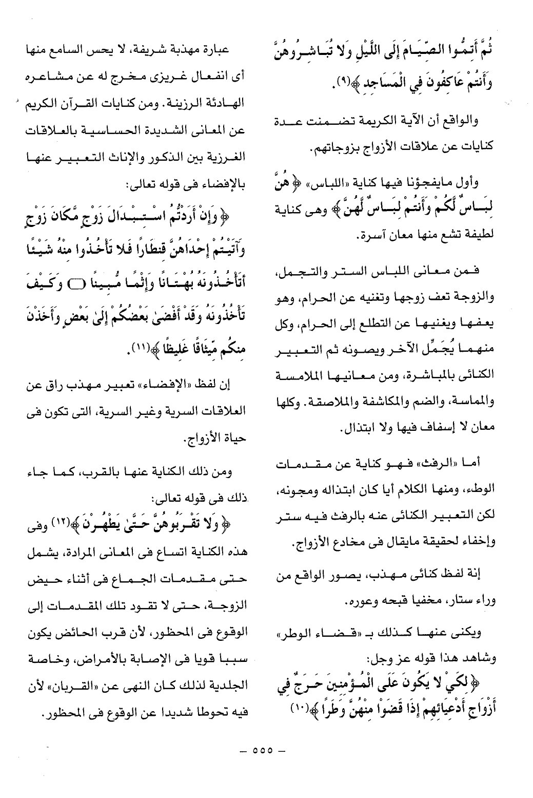 عبارة مهذبة شريفة، لا يحس السامع منها أى انفعال غريزى مخرج له عن مشاعره الهادئة الرزينة. ومن كنايات القرآن الكريم عن المعانى الشديدة الحساسية بالعلاقات الغرزية بين الذكور والإناث التعبير عنها بالإفضاء فى قوله تعالى:
