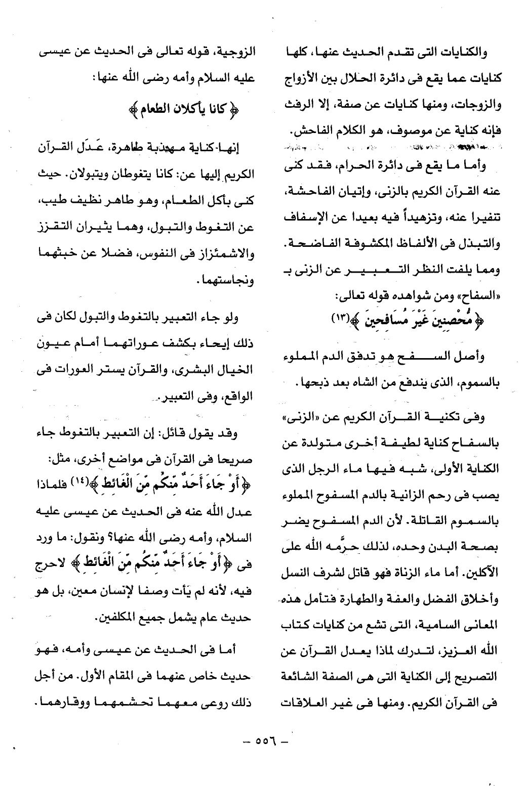 وفى تكنية القرآن الكريم عن «الزنى» بالسفاح كناية لطيفة أخرى متولدة عن الكناية الأولى، شبه فيها ماء الرجل الذى يصب فى رحم الزانية بالدم المسفوح المملوء بالسموم القاتلة. لأن الدم المسفوح يضر بصحة البدن وحده، لذلك حرّمه الله على الآكلين. أما ماء الزناة فهو قاتل لشرف النسل وأخلاق الفضل والعفة والطهارة فتأمل هذه المعانى السامية، التى تشع من كنايات كتاب الله العزيز، لتدرك لماذا يعدل القرآن عن التصريح إلى الكناية التى هى الصفة الشائعة فى القرآن الكريم. ومنها فى غير العلاقات الزوجية، قوله تعالى فى الحديث عن عيسى عليه السلام وأمه رضى الله عنها: