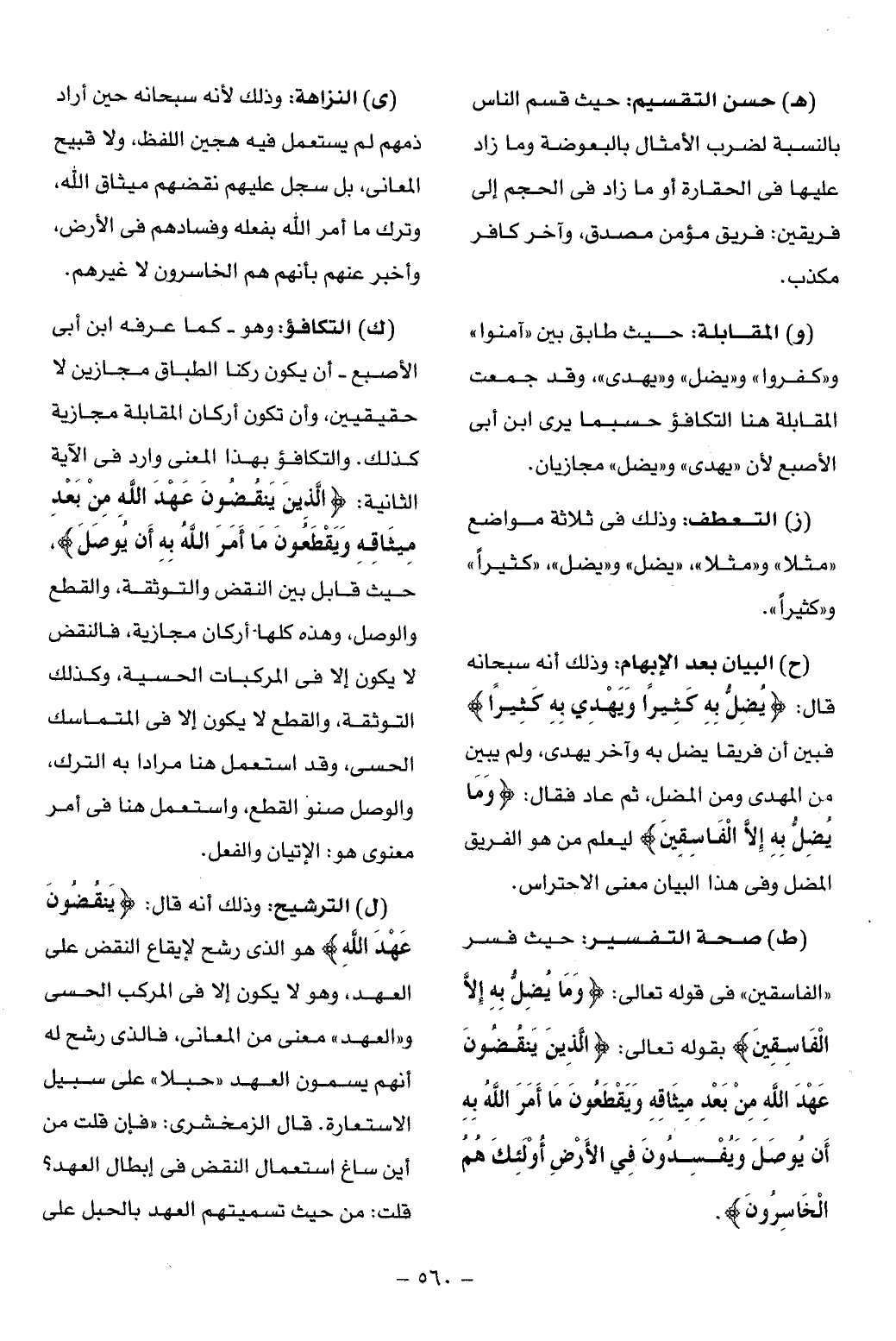 (ى) النزاهة: وذلك لأنه سبحانه حين أراد ذمهم لم يستعمل فيه هجين اللفظ، ولا قبيح المعانى، بل سجل عليهم نقضهم ميثاق الله، وترك ما أمر الله بفعله وفسادهم فى الأرض، وأخبر عنهم بأنهم هم الخاسرون لا غيرهم.