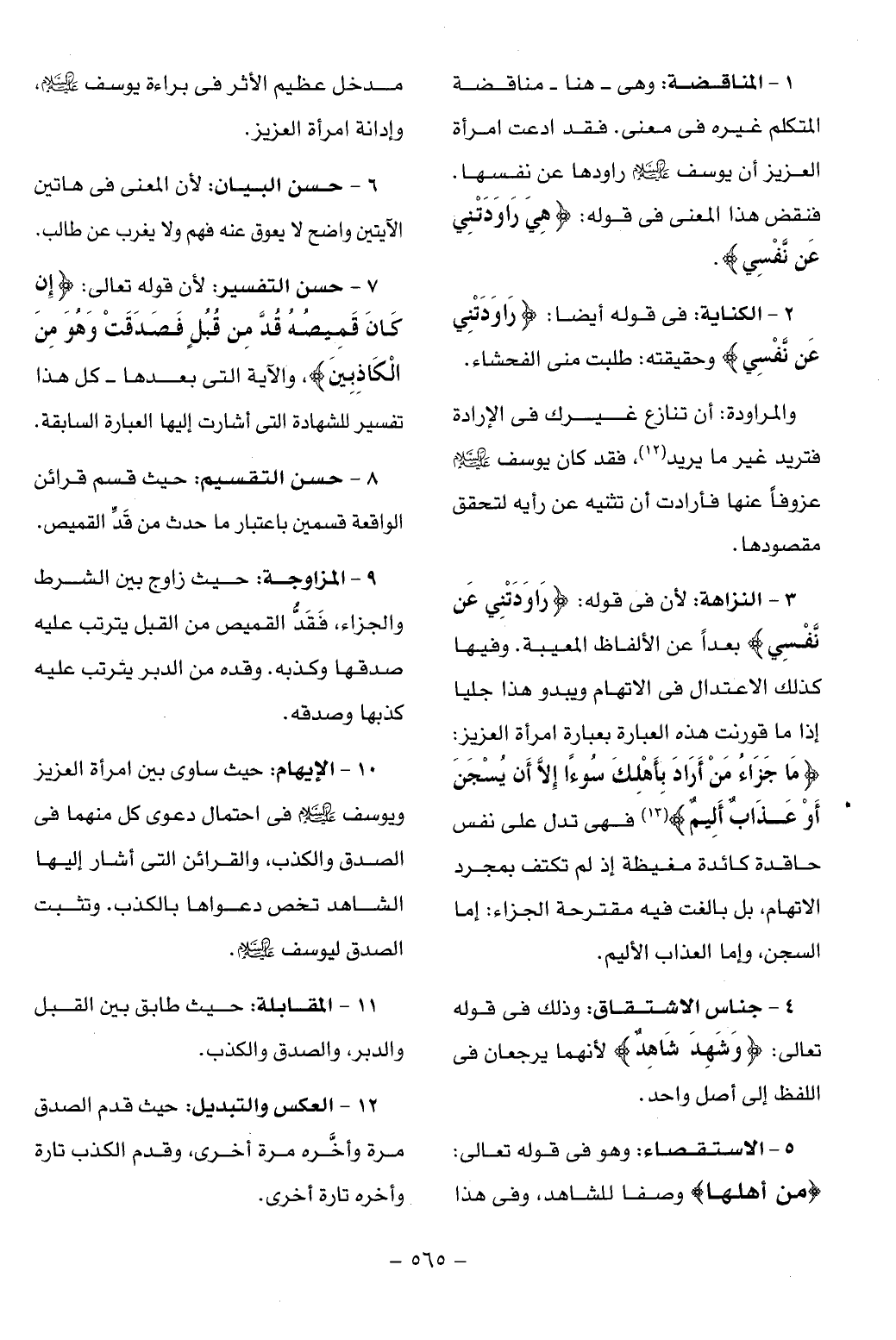 10 - الإيهام: حيث ساوى بين امرأة العزيز ويوسف عليه السّلام فى احتمال دعوى كل منهما فى الصدق والكذب، والقرائن التى أشار إليها الشاهد تخص دعواها بالكذب. وتثبت الصدق ليوسف عليه السّلام.