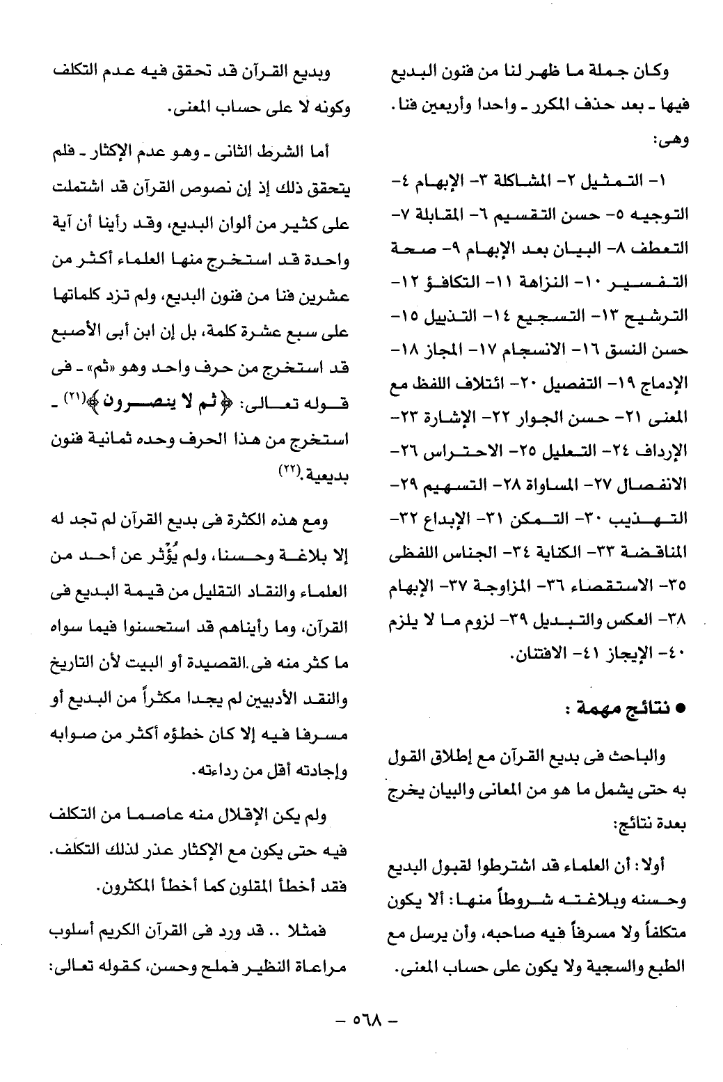 من عشرين فنا من فنون البديع، ولم تزد كلماتها على سبع عشرة كلمة، بل إن ابن أبى الأصبع قد استخرج من حرف واحد وهو «ثم» - فى قوله تعالى: ثُمَّ لا يُنْصَرُونَ (¬21) - استخرج من هذا الحرف وحده ثمانية فنون بديعية. (¬22)