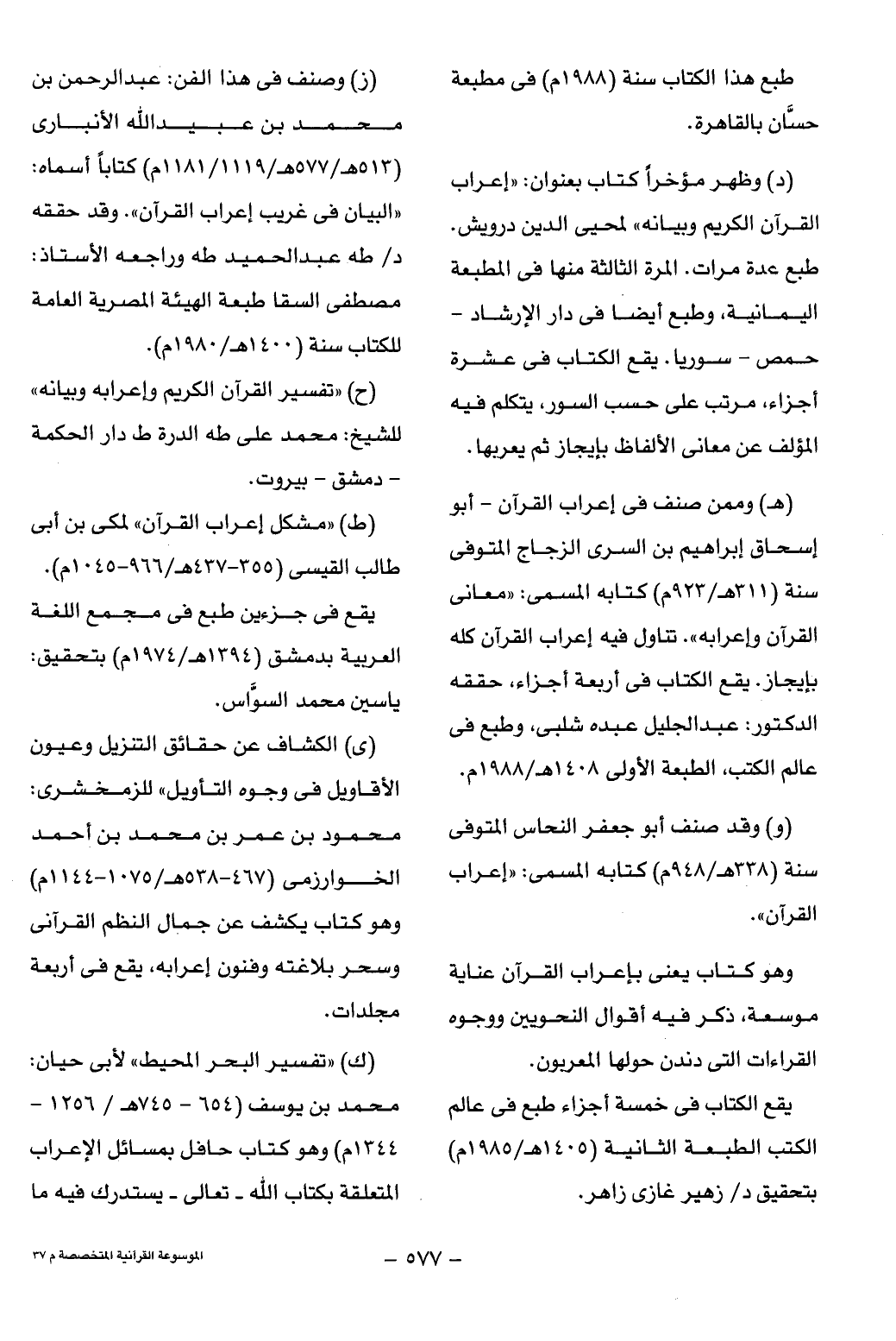 (هـ) وممن صنف فى إعراب القرآن- أبو إسحاق إبراهيم بن السرى الزجاج المتوفى سنة (311 هـ/ 923 م) كتابه المسمى: «معانى القرآن وإعرابه». تناول فيه إعراب القرآن كله بإيجاز. يقع الكتاب فى أربعة أجزاء، حققه الدكتور: عبد الجليل عبده شلبى، وطبع فى عالم الكتب، الطبعة الأولى 1408 هـ/ 1988 م.