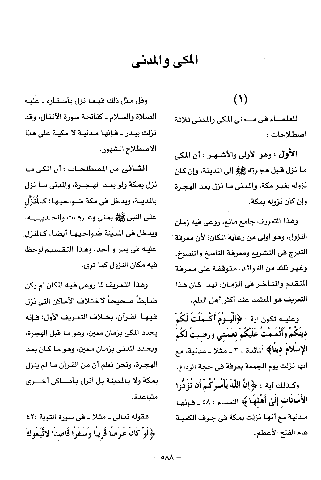 الأول: وهو الأولى والأشهر: أن المكى ما نزل قبل هجرته صلّى الله عليه وسلم إلى المدينة، وإن كان نزوله بغير مكة، والمدنى ما نزل بعد الهجرة وإن كان نزوله بمكة.