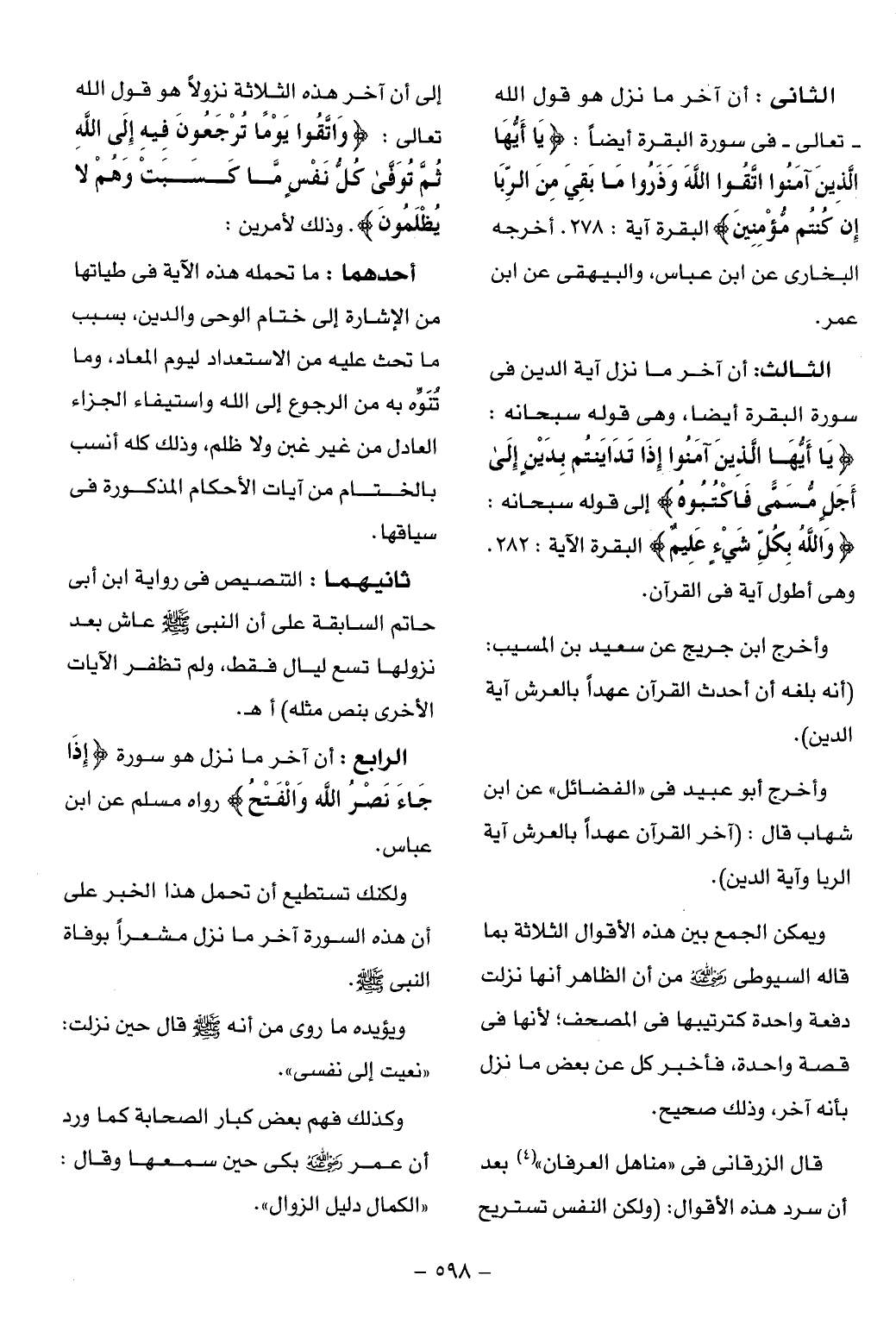 قال الزرقانى فى «مناهل العرفان» (¬4) بعد أن سرد هذه الأقوال: (ولكن النفس تستريح إلى أن آخر هذه الثلاثة نزولا هو قول الله تعالى: وَاتَّقُوا يَوْماً تُرْجَعُونَ فِيهِ إِلَى اللَّهِ ثُمَّ تُوَفَّى كُلُّ نَفْسٍ ما كَسَبَتْ وَهُمْ لا يُظْلَمُونَ. وذلك لأمرين: