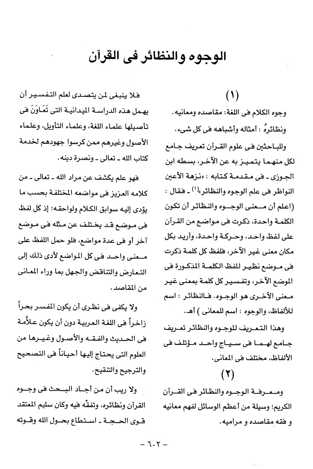 (اعلم أن معنى الوجوه والنظائر أن تكون الكلمة واحدة، ذكرت فى مواضع من القرآن على لفظ واحد، وحركة واحدة، وأريد بكل مكان معنى غير الآخر، فلفظ كل كلمة ذكرت فى موضع نظير للفظ الكلمة المذكورة فى الموضع الآخر، وتفسير كل كلمة بمعنى غير معنى الأخرى هو الوجوه. فالنظائر: اسم للألفاظ، والوجوه: اسم للمعانى) أهـ.