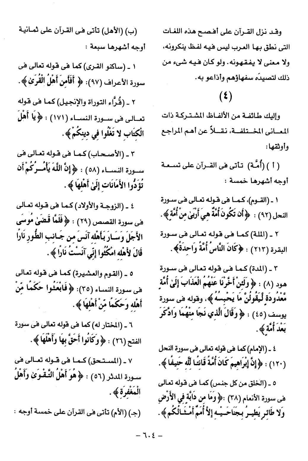 (ب) (الأهل) تأتى فى القرآن على ثمانية أوجه أشهرها سبعة: