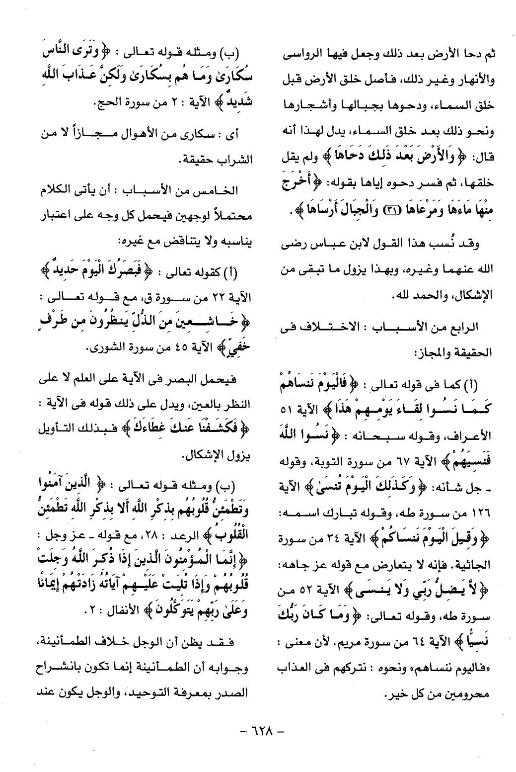 (ب) ومثله قوله تعالى: وَتَرَى النَّاسَ سُكارى وَما هُمْ بِسُكارى وَلكِنَّ عَذابَ اللَّهِ شَدِيدٌ الآية: 2 من سورة الحج.
