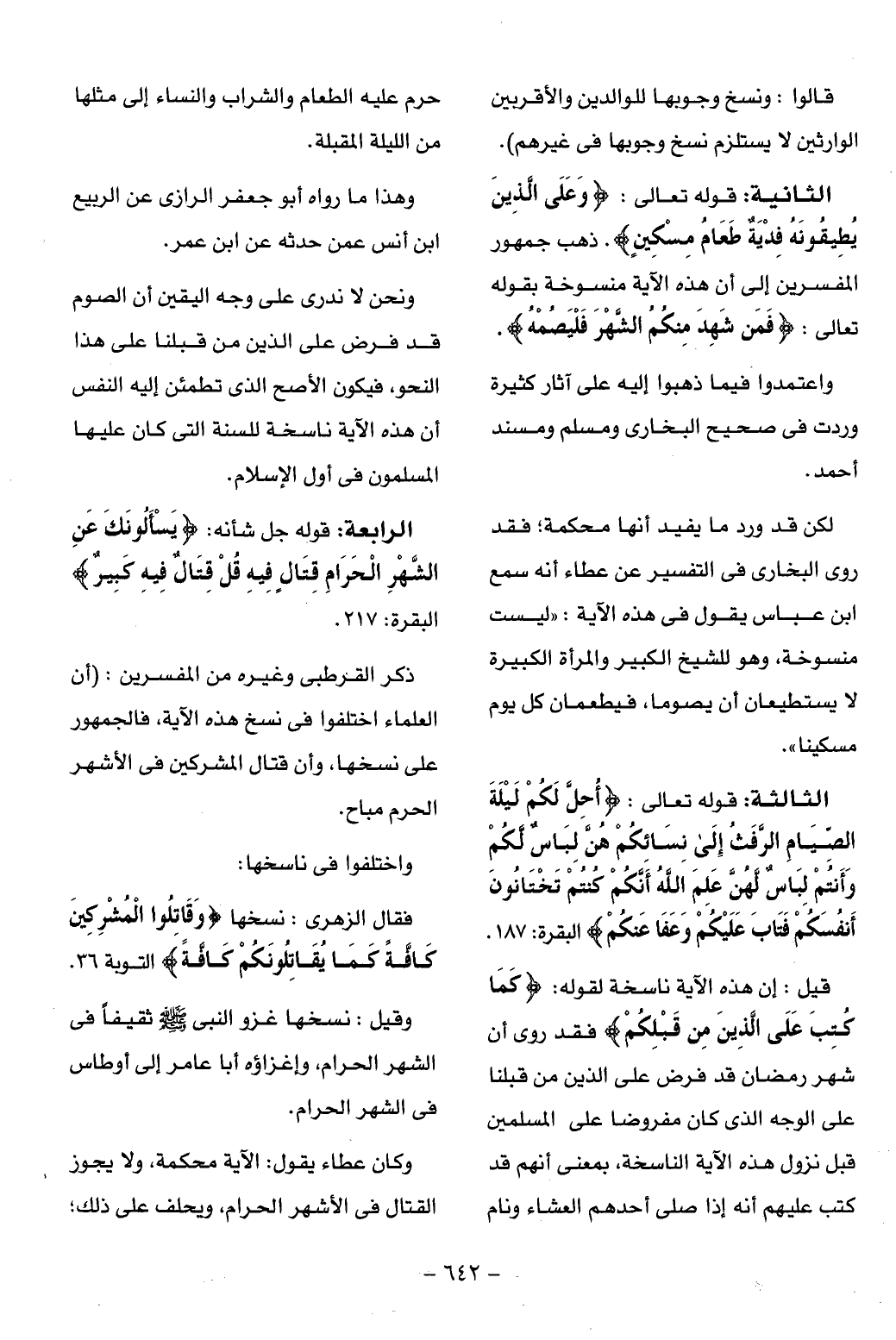 ذكر القرطبى وغيره من المفسرين: (أن العلماء اختلفوا فى نسخ هذه الآية، فالجمهور على نسخها، وأن قتال المشركين فى الأشهر الحرم مباح.