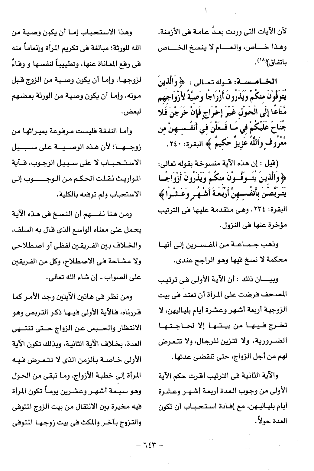 ومن نظر فى هاتين الآيتين وجد الأمر كما قررناه، فالآية الأولى فيها ذكر التربص وهو الانتظار والحبس عن الزواج حتى تنتهى العدة، بخلاف الآية الثانية، وبذلك تكون الآية الأولى خاصة بالزمن الذى لا تتعرض فيه المرأة إلى خطبة الأزواج، وما تبقى من الحول وهو سبعة أشهر وعشرين يوما تكون المرأة فيه مخيرة بين الانتقال من بيت الزوج المتوفى والتزوج بآخر والمكث فى بيت زوجها المتوفى