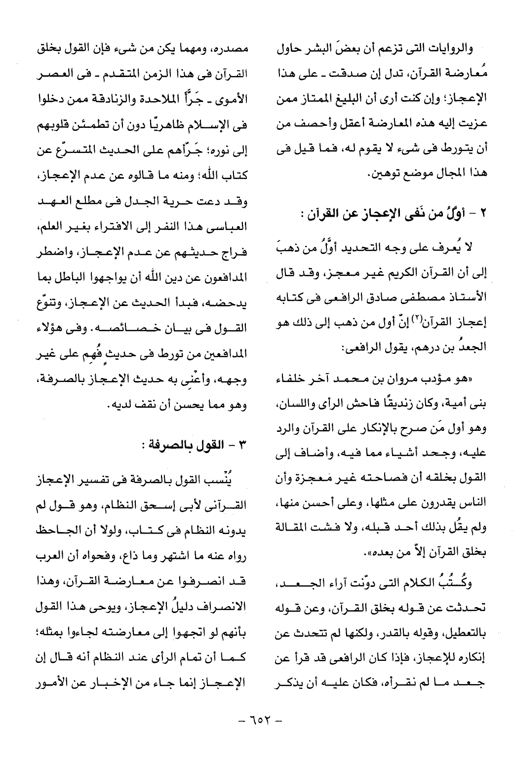 وكتب الكلام التى دوّنت آراء الجعد، تحدثت عن قوله بخلق القرآن، وعن قوله بالتعطيل، وقوله بالقدر، ولكنها لم تتحدث عن إنكاره للإعجاز، فإذا كان الرافعى قد قرأ عن جعد ما لم نقرأه، فكان عليه أن يذكر مصدره، ومهما يكن من شىء فإن القول بخلق القرآن فى هذا الزمن المتقدم- فى العصر الأموى- جرّأ الملاحدة والزنادقة ممن دخلوا فى الإسلام ظاهريّا دون أن تطمئن قلوبهم إلى نوره؛ جرّأهم على الحديث المتسرّع عن كتاب الله؛ ومنه ما قالوه عن عدم الإعجاز، وقد دعت حرية الجدل فى مطلع العهد العباسى هذا النفر إلى الافتراء بغير العلم، فراج حديثهم عن عدم الإعجاز، واضطر المدافعون عن دين الله أن يواجهوا الباطل بما يدحضه، فبدأ الحديث عن الإعجاز، وتنوّع القول فى بيان خصائصه. وفى هؤلاء المدافعين من تورط فى حديث فهم على غير وجهه، وأعنى به حديث الإعجاز بالصرفة، وهو مما يحسن أن نقف لديه.