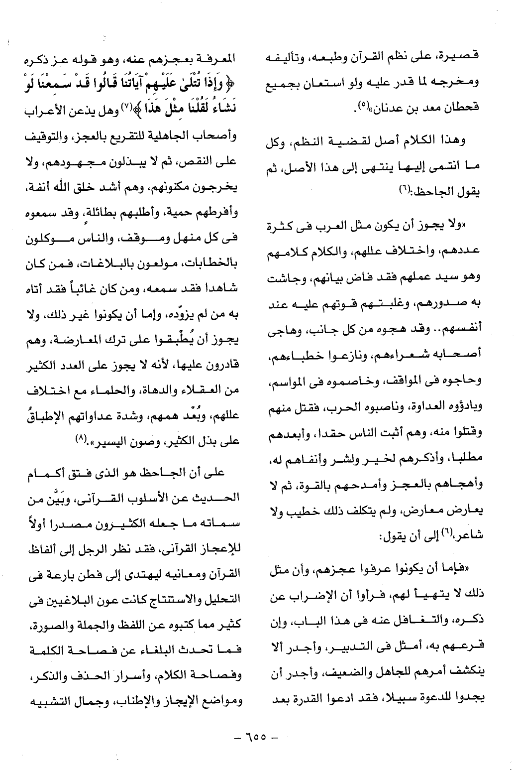 «ولا يجوز أن يكون مثل العرب فى كثرة عددهم، واختلاف عللهم، والكلام كلامهم وهو سيد عملهم فقد فاض بيانهم، وجاشت به صدورهم، وغلبتهم قوتهم عليه عند أنفسهم .. وقد هجوه من كل جانب، وهاجى أصحابه شعراءهم، ونازعوا خطباءهم، وحاجوه فى المواقف، وخاصموه فى المواسم، وبادءوه العداوة، وناصبوه الحرب، فقتل منهم وقتلوا منه، وهم أثبت الناس حقدا، وأبعدهم مطلبا، وأذكرهم لخير ولشر وأنفاهم له، وأهجاهم بالعجز وأمدحهم بالقوة، ثم لا يعارض معارض، ولم يتكلف ذلك خطيب ولا شاعر، (6) إلى أن يقول: