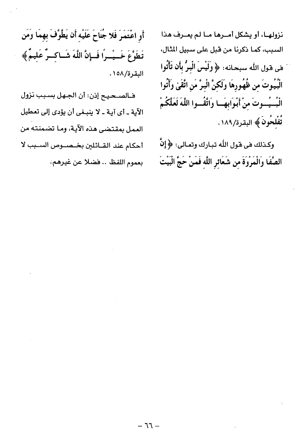 نزولها، أو يشكل أمرها ما لم يعرف هذا السبب، كما ذكرنا من قبل على سبيل المثال، فى قول الله سبحانه: وَلَيْسَ الْبِرُّ بِأَنْ تَأْتُوا الْبُيُوتَ مِنْ ظُهُورِها وَلكِنَّ الْبِرَّ مَنِ اتَّقى وَأْتُوا الْبُيُوتَ مِنْ أَبْوابِها وَاتَّقُوا اللَّهَ لَعَلَّكُمْ تُفْلِحُونَ البقرة/ 189.