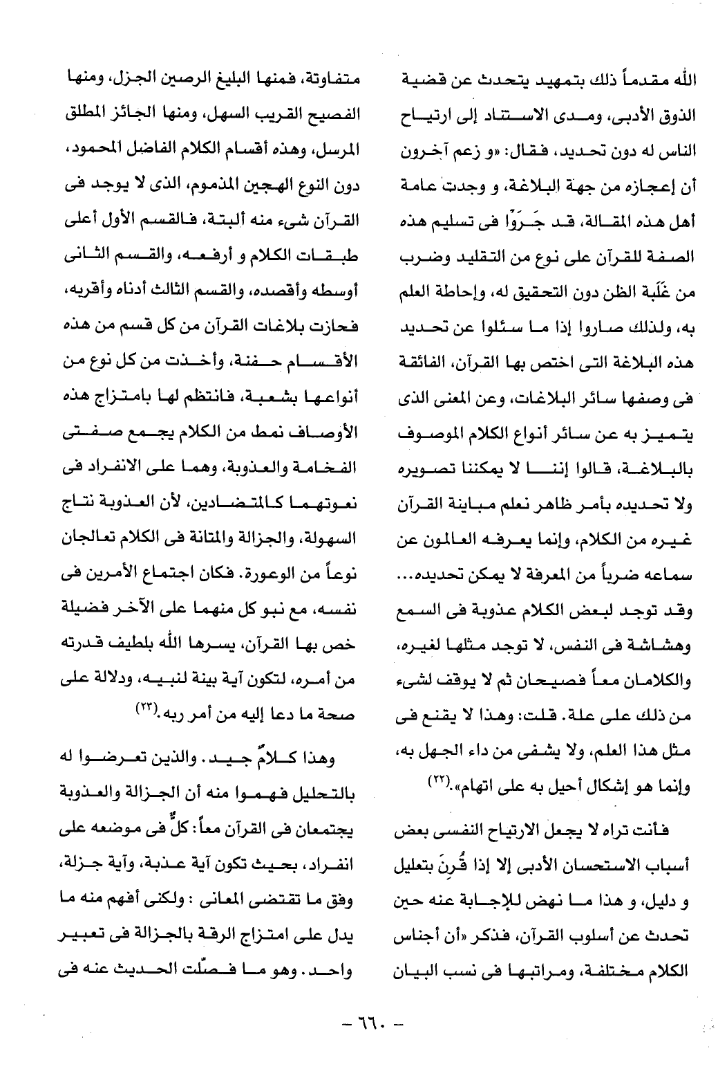 وهذا كلام جيد. والذين تعرضوا له بالتحليل فهموا منه أن الجزالة والعذوبة يجتمعان فى القرآن معا: كلّ فى موضعه على انفراد، بحيث تكون آية عذبة، وآية جزلة، وفق ما تقتضى المعانى: ولكنى أفهم منه ما يدل على امتزاج الرقة بالجزالة فى تعبير واحد. وهو ما فصّلت الحديث عنه فى