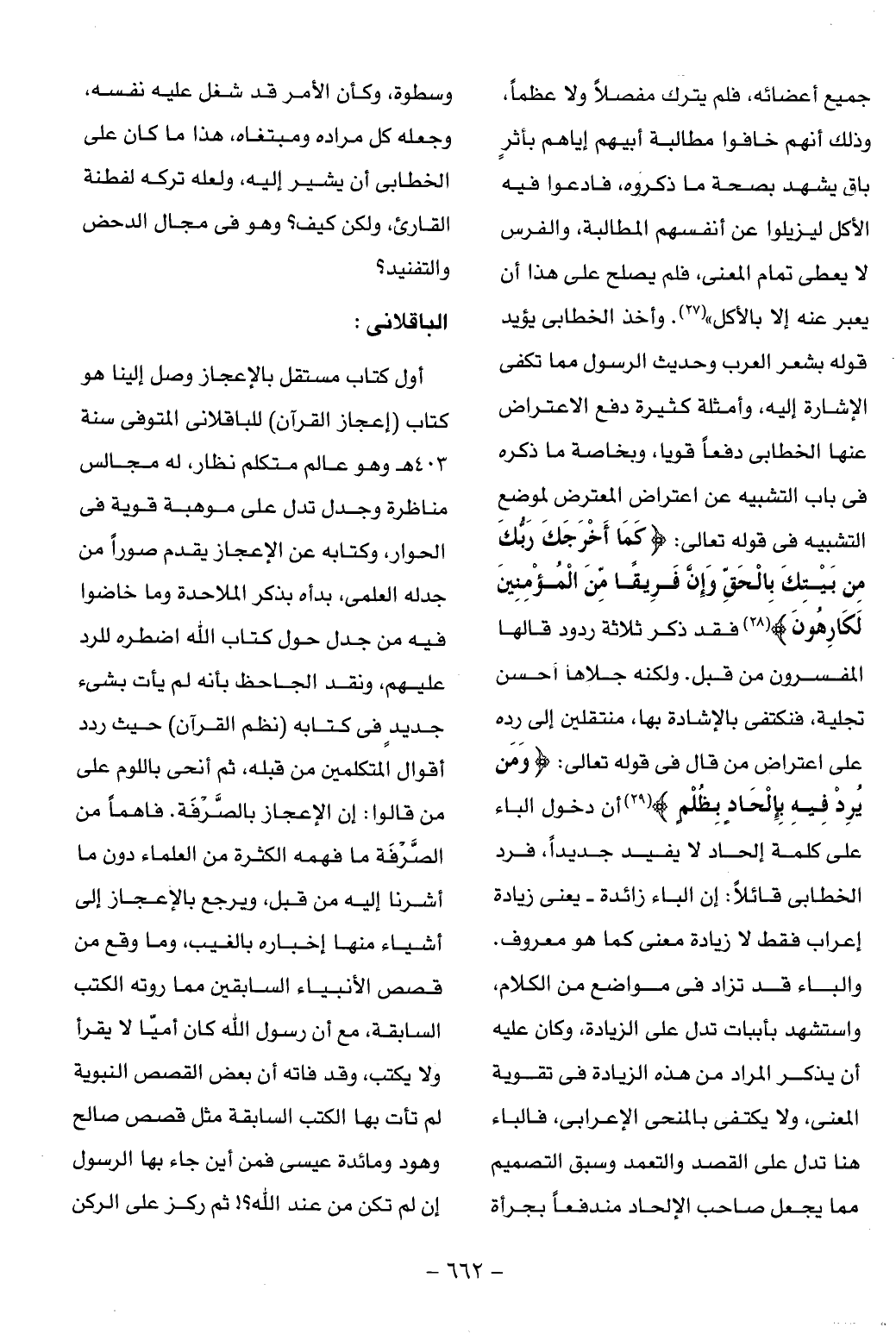 لا يعطى تمام المعنى، فلم يصلح على هذا أن يعبر عنه إلا بالأكل» (¬27). وأخذ الخطابى يؤيد قوله بشعر العرب وحديث الرسول مما تكفى الإشارة إليه، وأمثلة كثيرة دفع الاعتراض عنها الخطابى دفعا قويا، وبخاصة ما ذكره فى باب التشبيه عن اعتراض المعترض لموضع التشبيه فى قوله تعالى: كَما أَخْرَجَكَ رَبُّكَ مِنْ بَيْتِكَ بِالْحَقِّ وَإِنَّ فَرِيقاً مِنَ الْمُؤْمِنِينَ لَكارِهُونَ (¬28) فقد ذكر ثلاثة ردود قالها المفسرون من قبل. ولكنه جلاها أحسن تجلية، فنكتفى بالإشارة بها، منتقلين إلى رده على اعتراض من قال فى قوله تعالى: وَمَنْ يُرِدْ فِيهِ بِإِلْحادٍ بِظُلْمٍ (¬29) أن دخول الباء على كلمة إلحاد لا يفيد جديدا، فرد الخطابى قائلا: إن الباء زائدة- يعنى زيادة إعراب فقط لا زيادة معنى كما هو معروف.